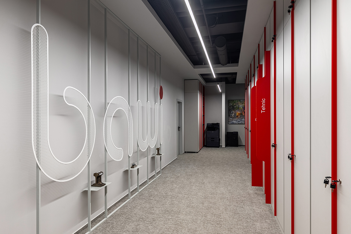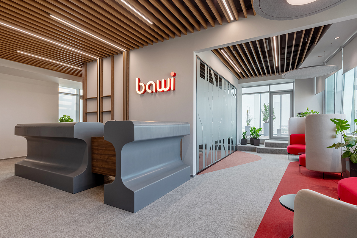 Paleta cromatică este dominată de gri și accente de roșu, reluând identitatea vizuală a BAWI și aducând un plus de vitalitate ansamblului. Mobilierul din PAL și MDF vopsit a fost realizat împreună cu CMA Atelier Design, în cadrul unei colaborări care, în cuvintele arhitectului Marilena Popa, „a fost o oportunitate de a crea un mobilier cu adevărat personalizat, care să răspundă atât nevoilor funcționale, cât și celor estetice ale proiectului Bawi. Împreună, am putut să ajustăm fiecare detaliu, de la alegerea materialelor, până la finisaje, pentru a asigura că piesele de mobilier se integrează perfect în conceptul general al spațiului. CMA Atelier Design a demonstrat un angajament solid față de detalii, asigurându-se că fiecare piesă de mobilier nu doar că arată bine, dar este și durabilă. Aceasta a fost o prioritate, având în vedere cerințele ridicate ale clientului și natura proiectului.