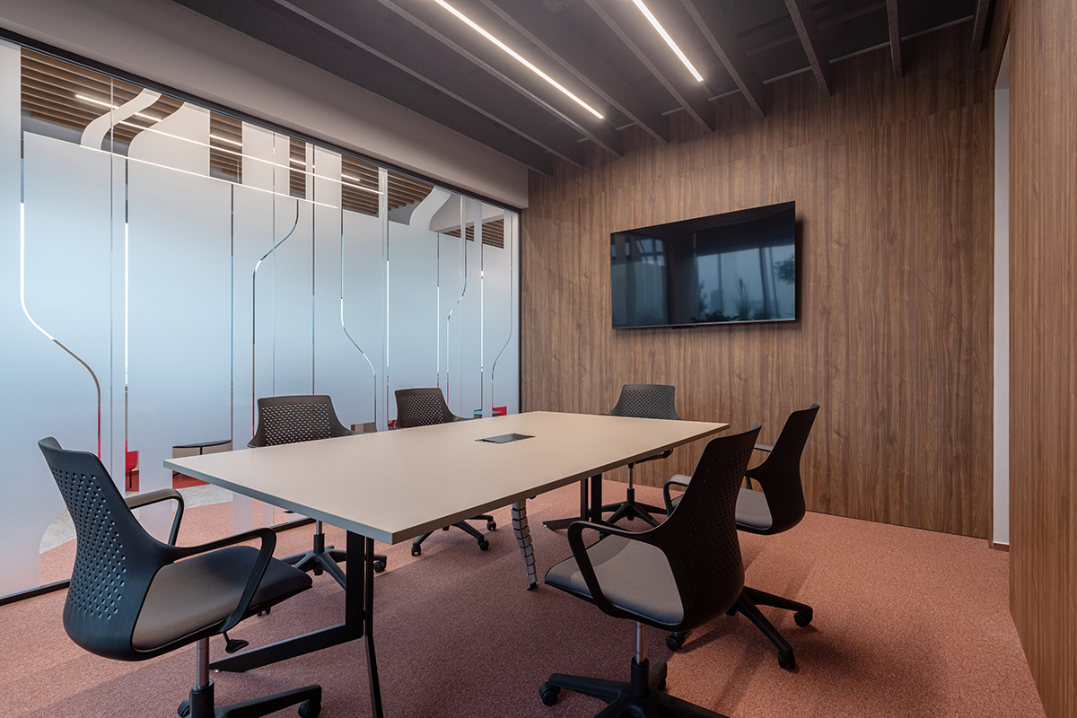 Pentru a menține o atmosferă clară și deschisă, toate birourile închise beneficiază de lumină naturală, prin compartimentări de sticlă atent poziționate. În cadrul partițiilor ce separă sălile de ședință de spațiul principal, suprafețele mate alternează, spre exterior, cu cele de oglindă, pentru a proteja confidențialitatea discuțiilor, creând un motiv ce amintește, din nou, de șinele de cale ferată. Același motiv este prezent în cadrul tapetului.