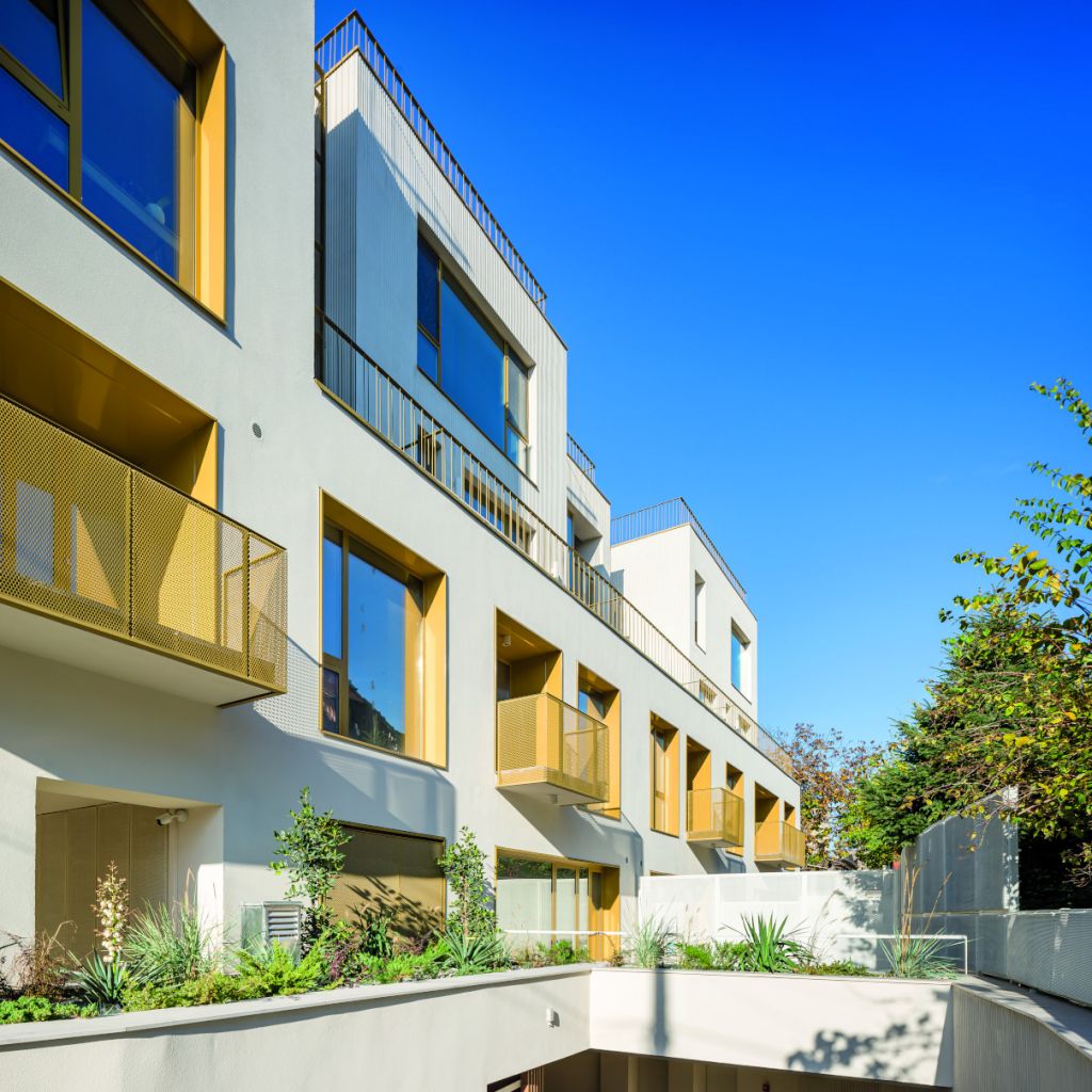Accesul frontal direct din stradă eliberează fațadele laterale de circulații și acordă apartamentelor de la parter grădini private pe ambele laturi ale terenului. Din acest motiv, zonele de zi sunt grupate la parter și la etajul al treilea (nivel care beneficiază de terase vaste și de o perspectivă mai frumoasă), iar etajele 1 și 2 sunt dedicate dormitoarelor. Volumetria este animată de balcoanele-sertar de la etajul 1, cu parapete din tablă expandată de culoare galbenă, în culoarea tâmplăriilor.