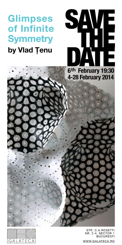 Joi, 6 februarie, orele 19.30, Galateca vă invită la vernisajul expoziţiei “Glimpses of Infinite Symmetry”. Expoziţia alătură o serie de instalaţii realizate de Vlad Ţenu, ce s-au născut în urma unor procese de cercetare în design dedicate genezei formei şi spaţiului. O parte din aceste lucrări au fost expuse anterior la diverse galerii din Londra, printre care şi Arup Phase2, Testbed1 sau Surface Gallery, artistul realizând şi o instalaţie nouă, special pentru proiectul de la Galateca.