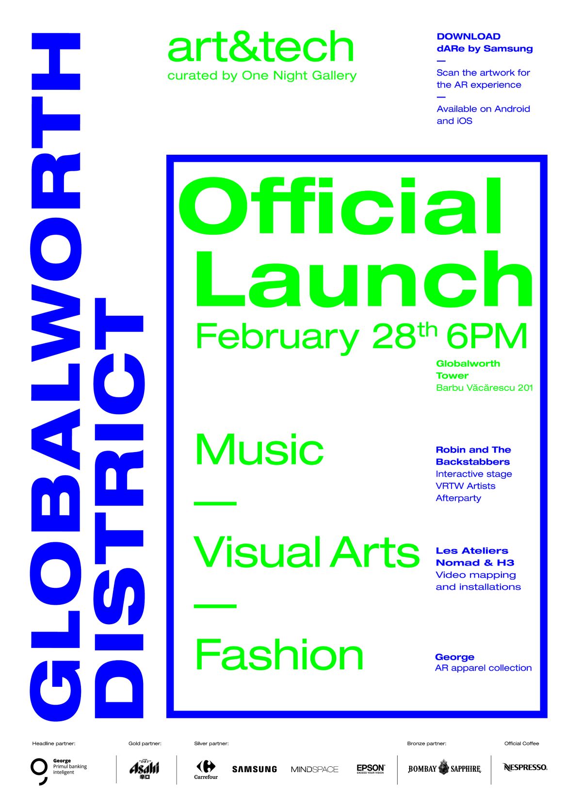 Evenimentul de lansare a Globalworth District va avea loc pe 28 februarie, de la ora 18:00, în clădirea de birouri Globalworth Tower (Barbu Văcărescu 201), și va îmbina într-un show imersiv, conceput de One Night Gallery, tehnologia cu muzica, artele vizuale și design-ul vestimentar. Lobby-ul clădirii va fi scena pentru un eveniment new media art care aduce împreună un concert neconvențional Robin and The Backstabbers, instalații și proiecții realizate de Les Ateliers Nomad și H3, ilustrații supradimensionate de Bogdan Moraru și animate de Tudor Calnegru și colecția George. Primul banking inteligent. Inovație BCR, cu haine ilustrate de artiștii One Night Gallery, ce poate fi scanată în realitate augmentată cu aplicația dARe by Samsung.