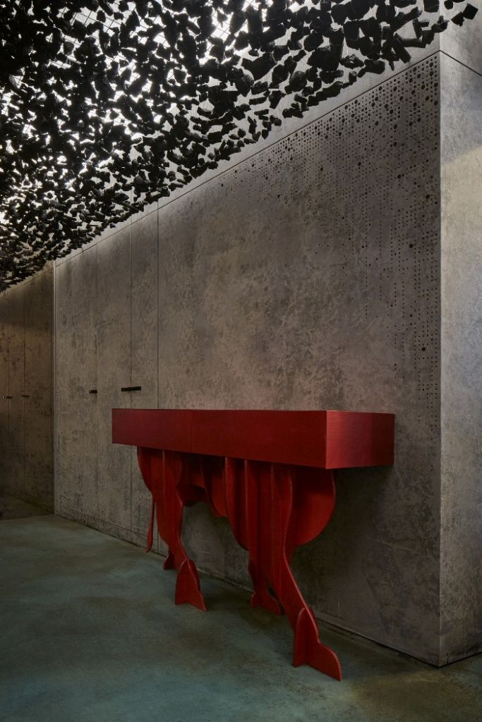 În zona de intrare, peretele decorativ din blocuri de beton, fiecare conţinând o bucată de cărbune, reprezintă o declaraţie vizuală a noii filozofii a localului. Deoarece, la nivel global, industria cărbunelui contribuie la despădurire, antrenând, astfel, o serie de efecte negative considerabile, precum fenomenele meteorologice extreme, conducerea Gran Fierro a luat decizia de a folosi bio cărbune. Acesta este fabricat în bucătăria proprie, din deşeuri vegetale. Motivul cărbunelui este reluat în cadrul uneia dintre zonele de lounge, unde tavanul boltit este decorat cu bucăţi de cărbune suspendate.