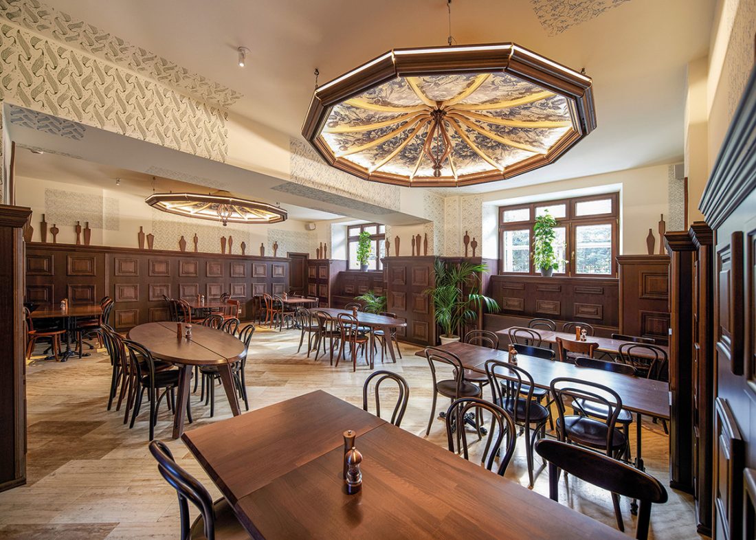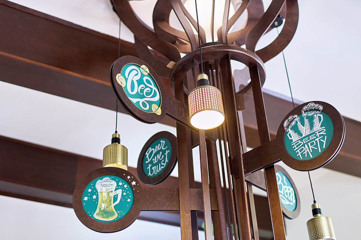 Alături de colecția de halbe ceramice, vase de cositor și tipsii de aramă, vagi siluete abstracte (clondire, glastre, personaje?) se integrează cromatic și textural în ambianța localului. Capacul unei sticle de bere, supradimensionat, a inspirat realizarea unor corpuri de iluminat moderne, cu aluzii vintage. Batalioane de rame, grupate strâns pe pereți, conțin câteva fotografii de epocă, dar cele mai multe, rezervate viitorimii, au un rol decorativ și simbolic.