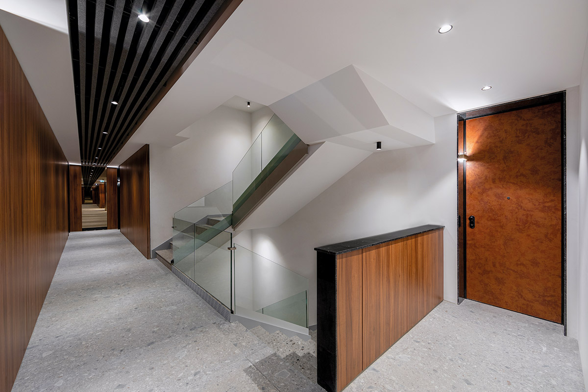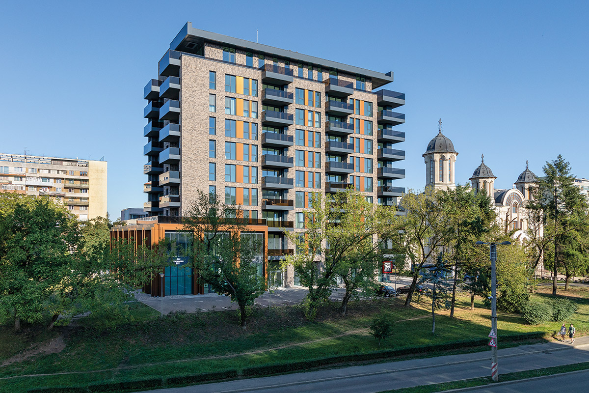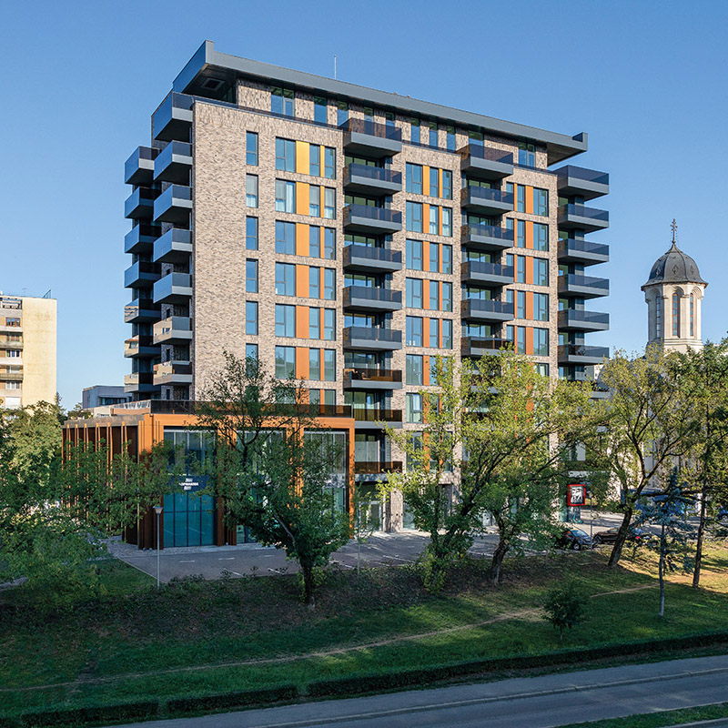 Elementele verticale care înglobează nivelul parterului și al mezaninului subliniază metafora unui portic definit de geometria curată, suprafața lisă și cromatica caldă a plăcilor compozite de alucobond. Nivelul ridicat de detaliu al porticului îi sporește monumentalitatea, aceasta fiind remarcată atât la nivel urban, cât și la nivelul percepției imediate a utilizatorului. Inserțiile de alucobond din partea superioară sudează legătura dintre cele două unități volumetrice. Prezența sticlei fumurii la nivelul balcoanelor întregește eleganța paletarului de materiale folosite și menține intimitatea.