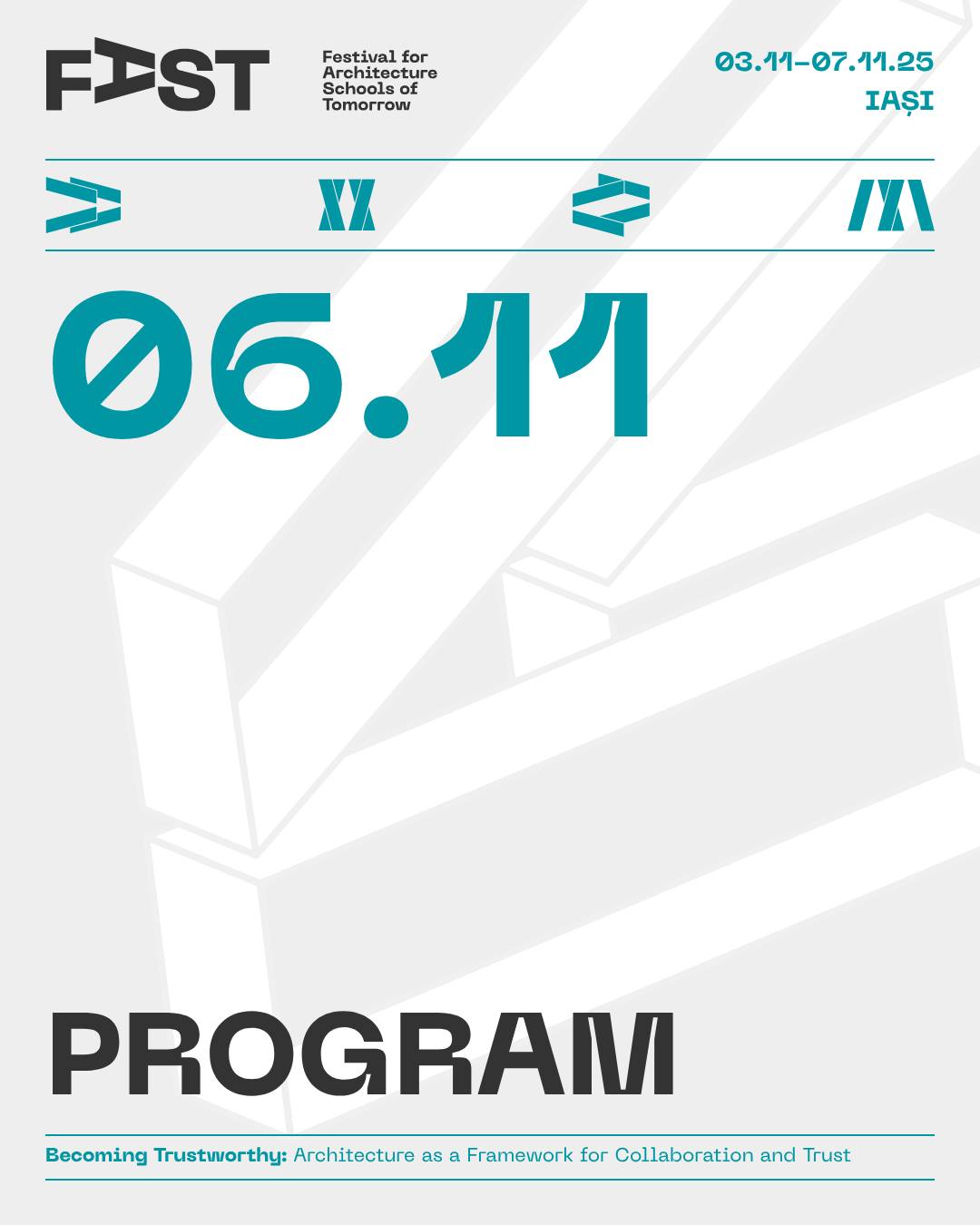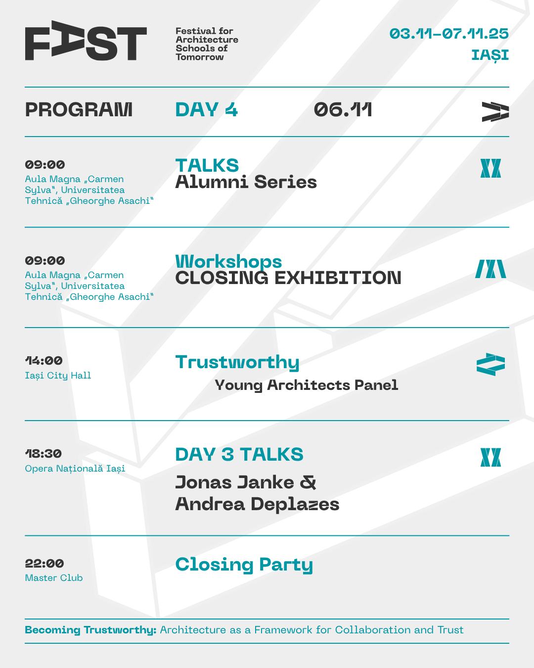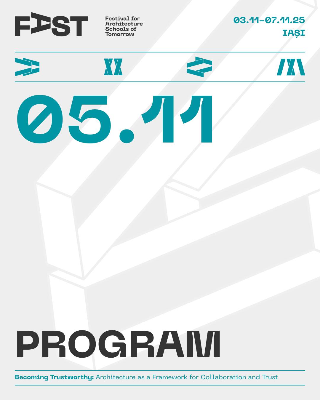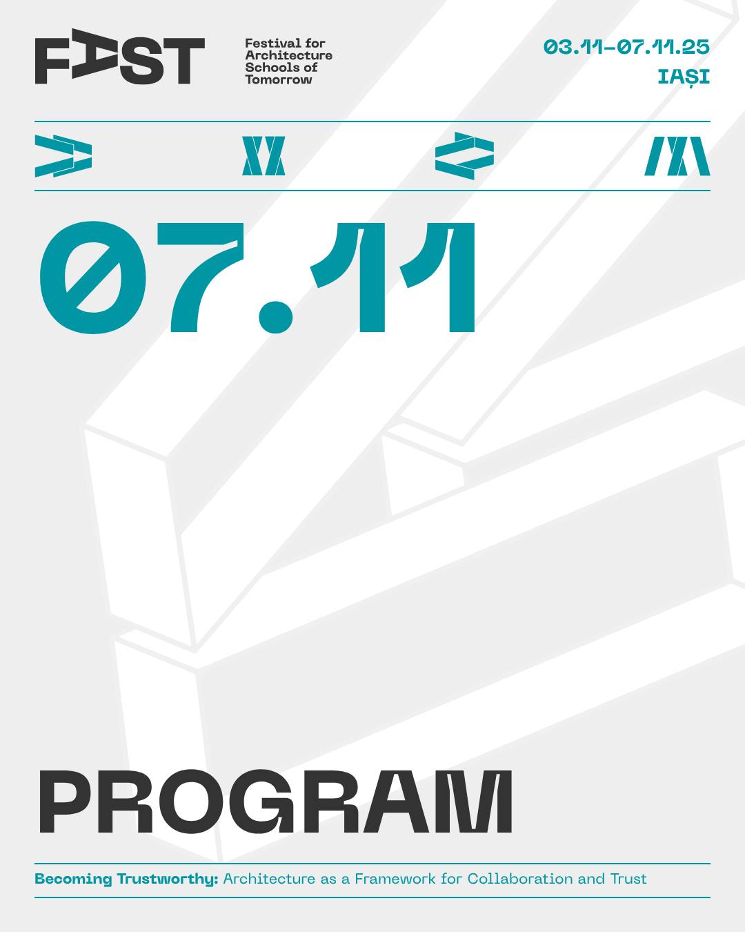 Din 3 noiembrie, Iașiul devine pentru 5 zile capitala arhitecților și a tuturor celor interesați de profesie și de viitorul orașelor noastre. FAST: Festival for Architecture Schools of Tomorrow, primul festival românesc dedicat viitorului profesiei și mediului construit, are loc între 3 și 7 noiembrie la Iași, cu participarea unor nume de prim rang în arhitectura mondială și a comunității profesionale din țară și din regiune. Urmează 5 zile de conferințe-eveniment, expoziții, experimente participative, concerte, tururi de arhitectură și ateliere în care explorăm tematica ediției, inspirată – ca în fiecare an – din ceea ce se discută pe scenele internaționale (Congresele Uniunii Internaționale a Arhitecților UIA): Becoming Trustworthy. Arhitectura ca mediu al încrederii.