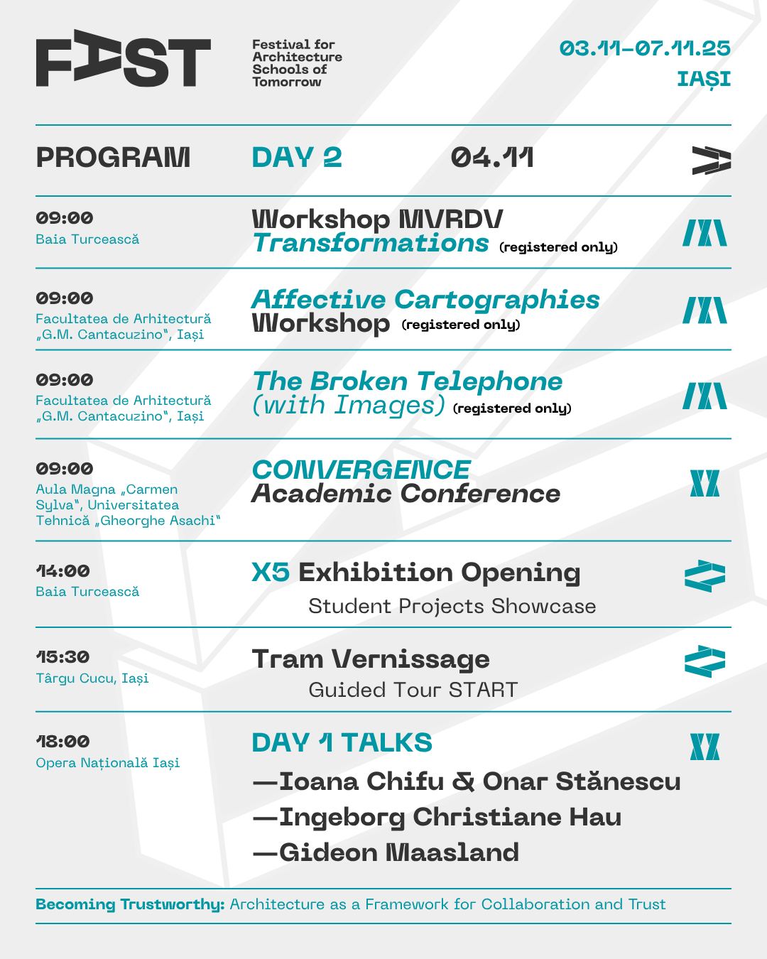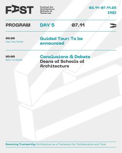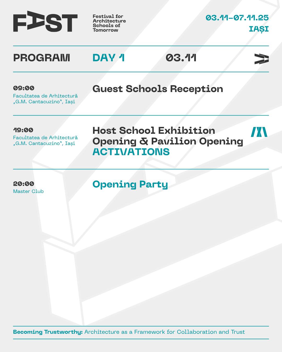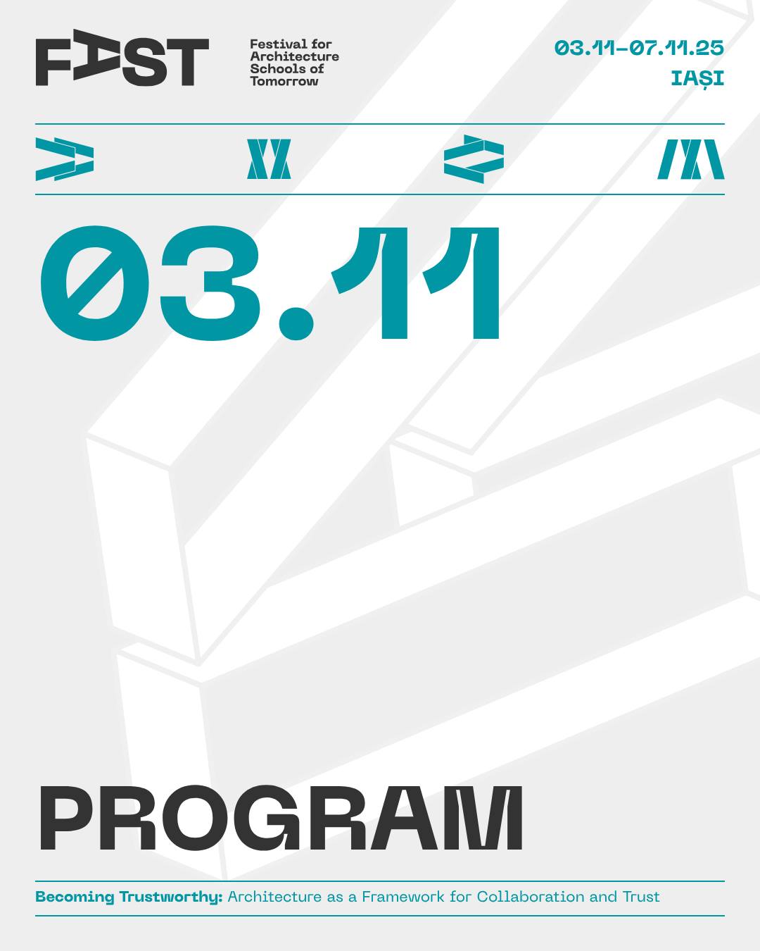 Din 3 noiembrie, Iașiul devine pentru 5 zile capitala arhitecților și a tuturor celor interesați de profesie și de viitorul orașelor noastre. FAST: Festival for Architecture Schools of Tomorrow, primul festival românesc dedicat viitorului profesiei și mediului construit, are loc între 3 și 7 noiembrie la Iași, cu participarea unor nume de prim rang în arhitectura mondială și a comunității profesionale din țară și din regiune. Urmează 5 zile de conferințe-eveniment, expoziții, experimente participative, concerte, tururi de arhitectură și ateliere în care explorăm tematica ediției, inspirată – ca în fiecare an – din ceea ce se discută pe scenele internaționale (Congresele Uniunii Internaționale a Arhitecților UIA): Becoming Trustworthy. Arhitectura ca mediu al încrederii.