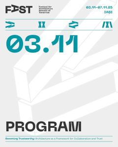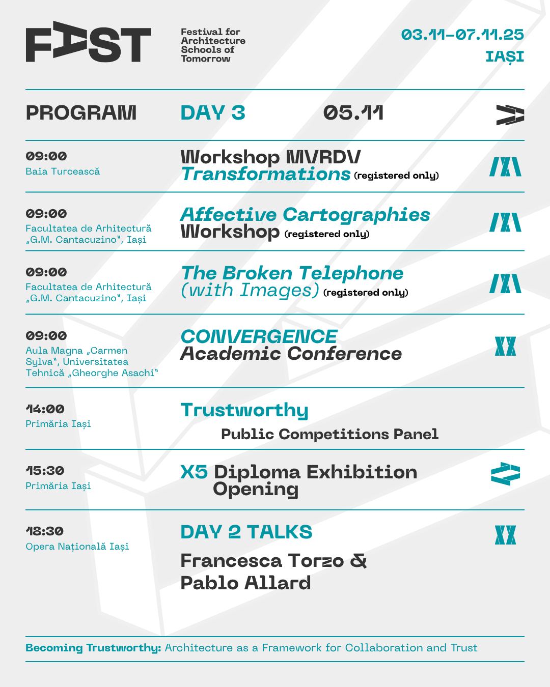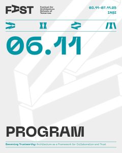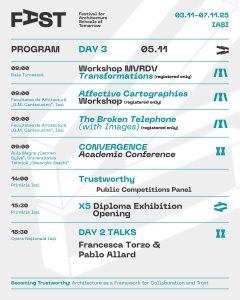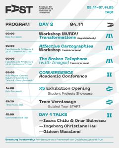 Prin tematica preluată de la Forumul Uniunii Internaționale a Arhitecților, FAST reflectă anual provocările globale, raportându-se la realitățile locale și la evoluțiile societății de mâine. Anul acesta, pe parcursul celor cinci zile de festival, explorăm intersecțiile dintre educație, practică profesională și fenomenele curente la care profesia trebuie să răspundă. Discutăm rolul arhitecturii în cultivarea încrederii, în spațiul public, în colaborările profesionale și în relația dintre comunități și instituții.