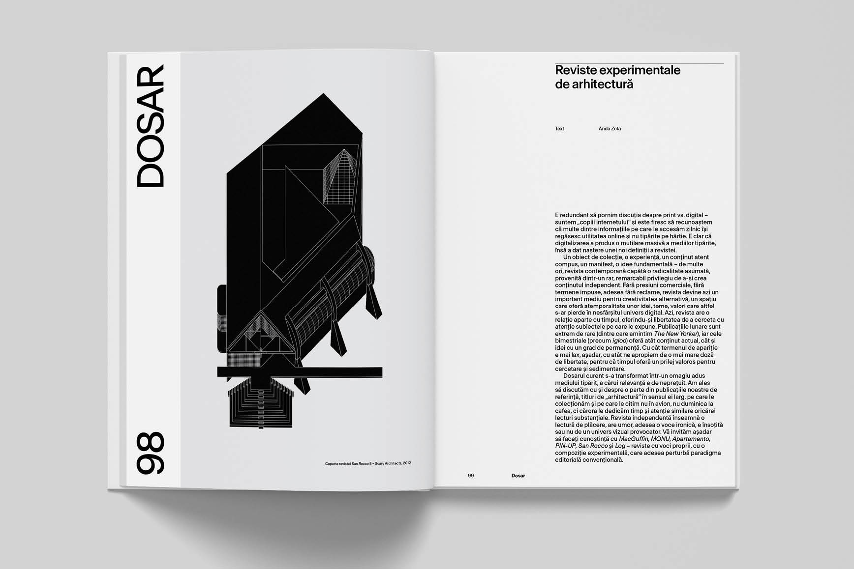 Dosarul noului număr igloo revine la o căutare esențială pentru orice revistă de arhitectură – relația dintre text și spațiul construit – și privește către câteva propuneri editoriale inedite de reviste experimentale de arhitectură. Am ales publicații care ne plac și care ne inspiră, reviste altfel, surprinzătoare, care propun un discurs diferit, într-un exercițiu critic alternativ, dar nu mai puțin ludic, titluri a căror existență pe hârtie devine un manifest grafic și editorial.