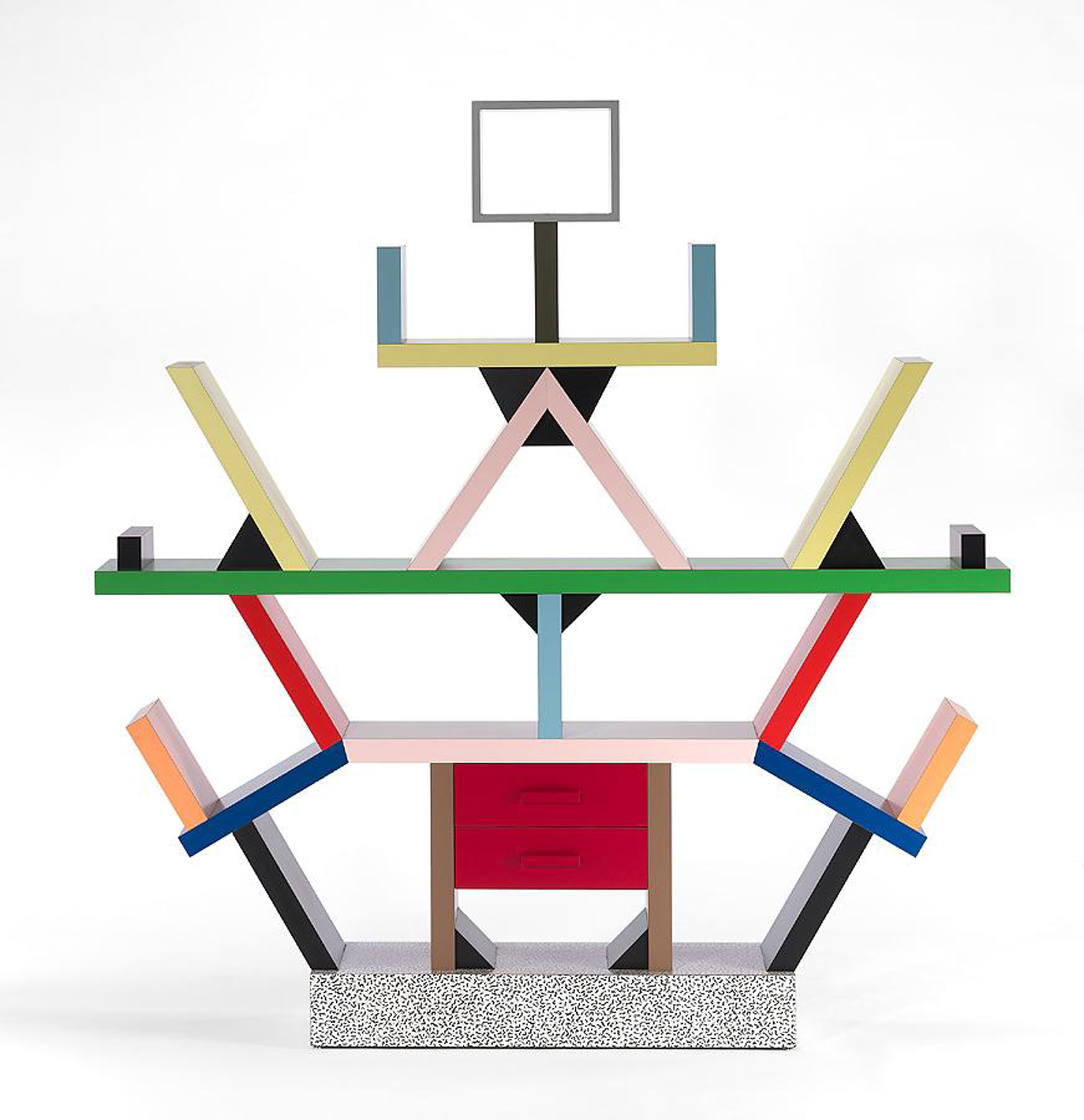 La Eclectico Studio găsim o colecție impresionantă de piese Ettore Sottsass. Pentru selecția noastră am ales celebra bibliotecă memphis design Carlton, realizată în Italia în 1981.