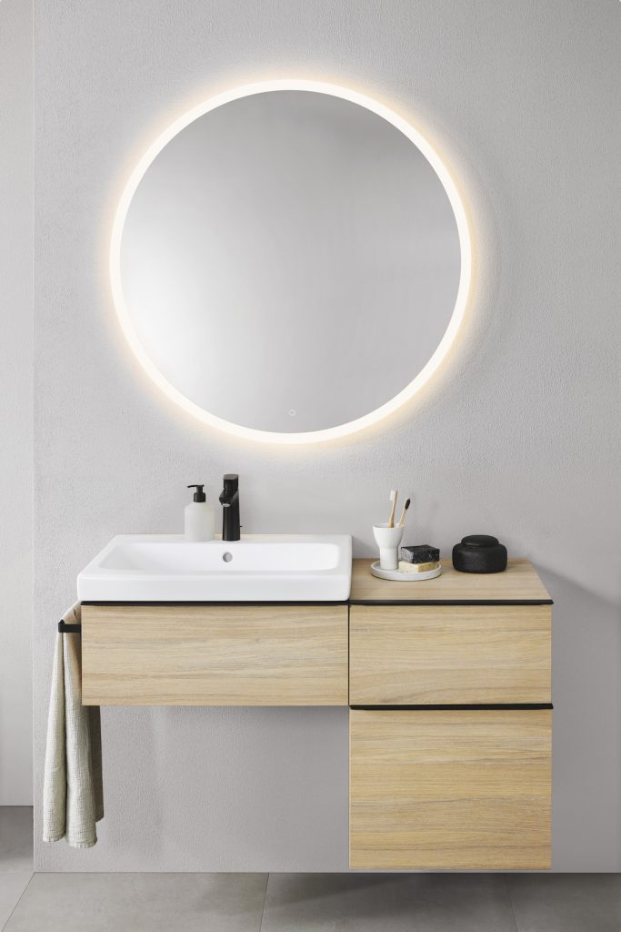 Oglinda Option Round de la Geberit este una dintre soluțiile preferate ale arhitecților atunci când vine vorba de accesorizarea și iluminarea unei băi. Disponibilă în multiple diametre, oferă atât iluminat direct, cât și ambiental, pe un spectru ajustabil printr-un senzor tactil aplicat pe suprafața de sticlă. Disponibilă pe geberit.ro.