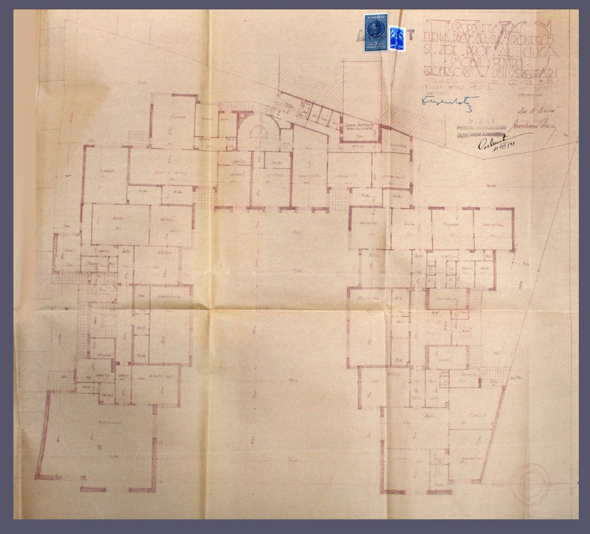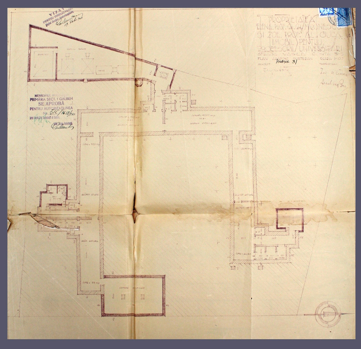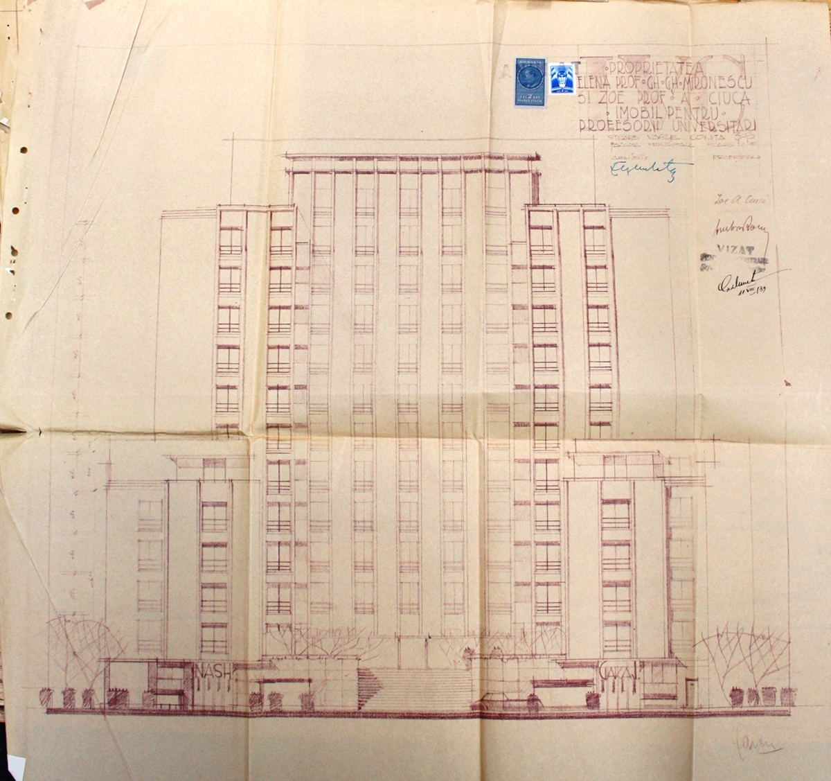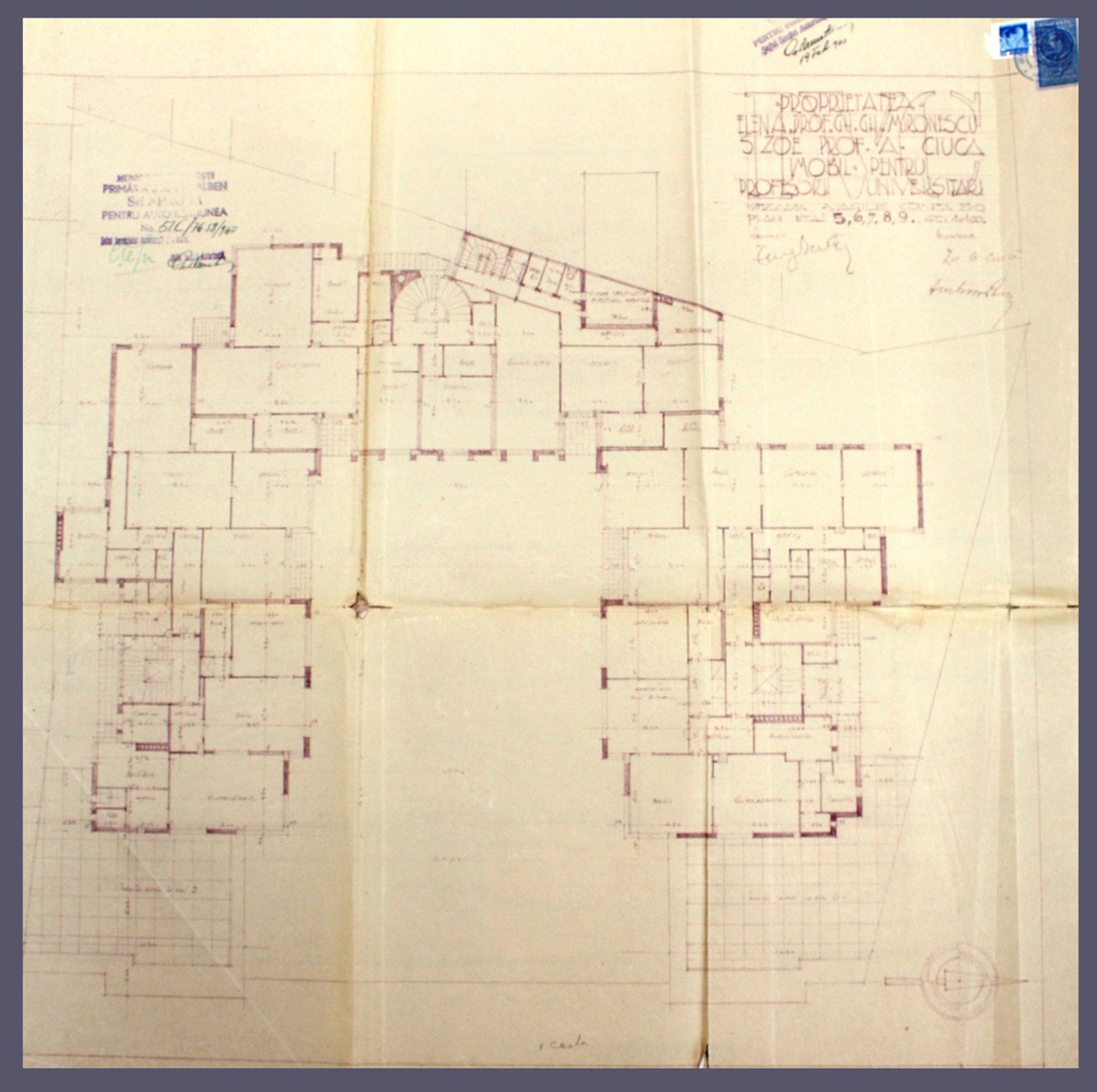 Dosarul consistent de autorizare 1 Galben 507/1939, dezvăluie un imobil de apartamente dedicat profesorilor universitari, atât din Capitală cât și din țară, având un regim de înălțime 3S+P+11E+Pod (cele două laturi perpendiculare pe str. Vasile Conta având, mai întâi, către stradă 3S+P+4E și, ulterior, 3S+P+9E), proprietari fiind Elena Mironescu, soția Consilierului Regal, prof. Gh. Mironescu și Zoe, soția prof. A. Ciucă.