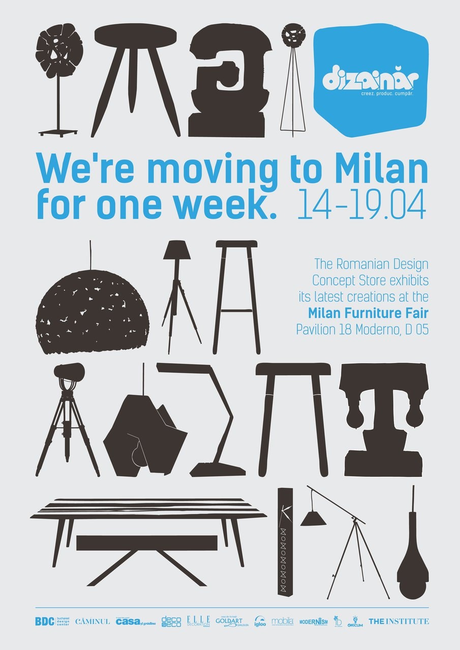 Între 14 și 19 aprilie, adresa Dizainăr devine Pavilionul 18 Moderno, standul D05. Corpuri de iluminat, piese de mobilier, decorațiuni și accesorii românești vor fi prezentate publicului de la Milano. Dizainăr lansează, în premieră, masa „Exhibit A” (design realizat de echipa Dizainăr) şi scaunul „Nostro” (design Alexandru Ioniță).