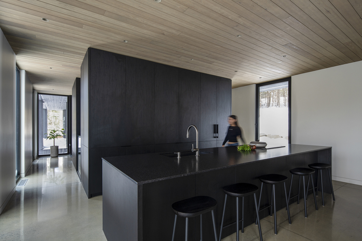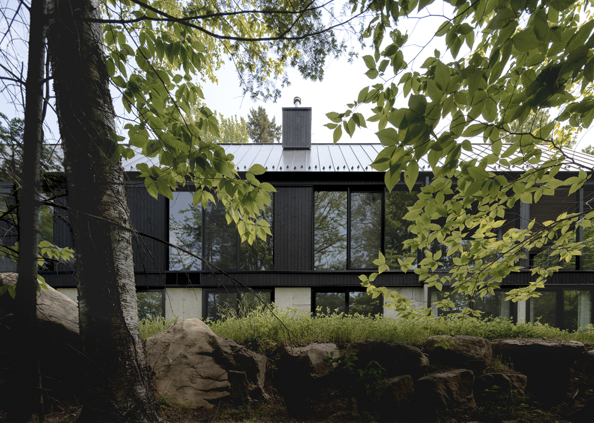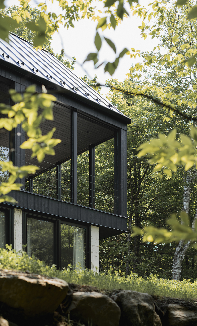 Cuibărită într-un cadru natural spectaculos, în munții Laurentini, la mică distanță de două stațiuni de schi și bucurându-se de vecinătatea lacului, casa servește drept refugiu contemporan pentru o familie din mediul urban. Cu o arhitectură discretă și fațade atent gradate, unde plinurile alternează cu goluri generoase, noua structură invită la o descoperire treptată și, în același timp, pare că se dizolvă în peisajul înconjurător, devenind una cu acesta.