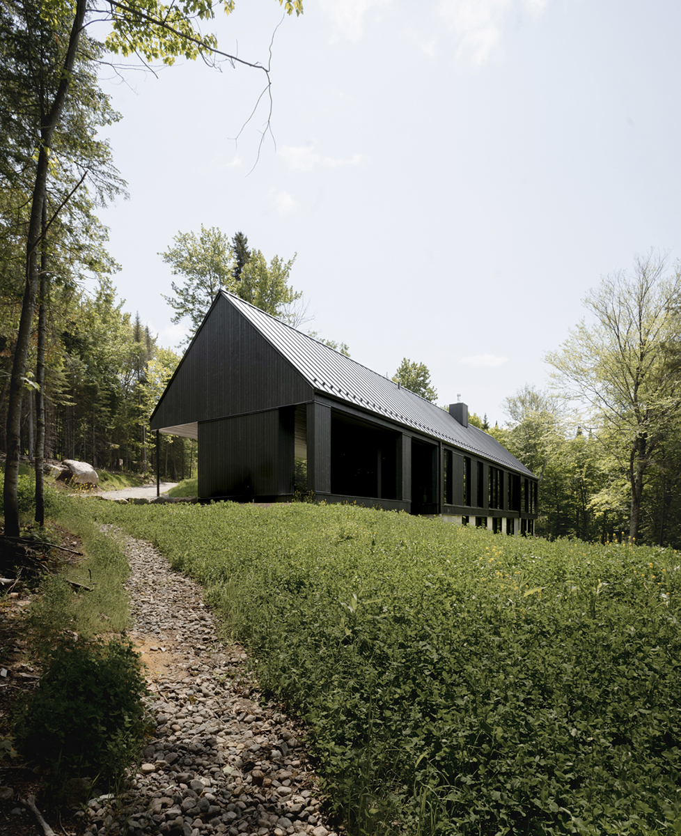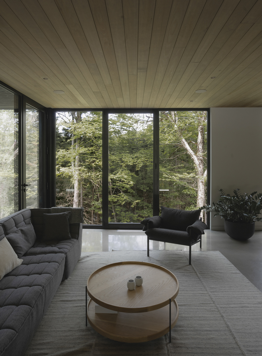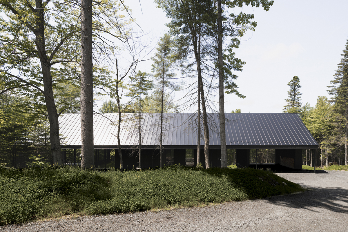 Inspirându-se din arhitectura vernaculară a regiunii Québec, proiectul reinterpretează tipologia casei tradiționale cu fronton. O formă paralelipipedică simplă este împărțită în trei volume, creând mai multe puncte de belvedere care încadrează priveliști spre lac. Compoziția rezultată, unită sub un acoperiș metalic, reflectă un echilibru calm, sensibil la particularitățile peisajului. Paleta restrânsă de materiale naturale susține caracterul discret al casei. Ferestrele punctează volumul, aducând natura în interior, iar texturile subtile ale fațadelor surprind, pe întreg parcursul zilei, jocul de lumini și umbre, estompând linia dintre arhitectură și mediu.