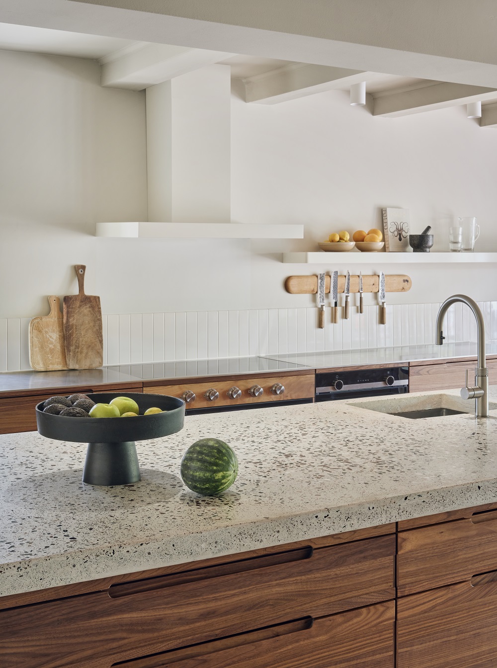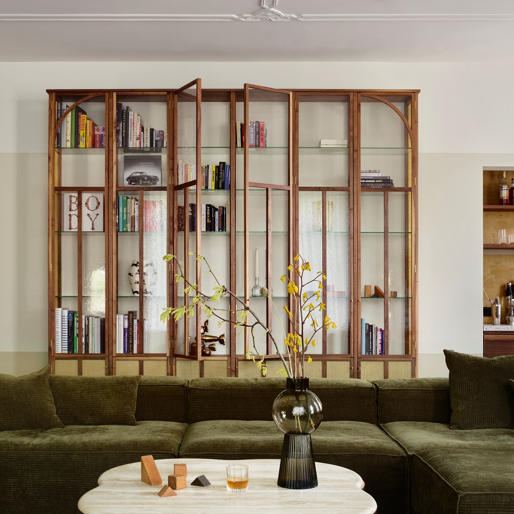 La etaj, chiar deasupra bucătăriei se află holul intrării, la nivelul digului, apoi se intră în cea mai spectaculoasă parte a casei – livingul. Mobilierul vintage și detaliile art deco se încadrează armonios în spațiul conturat în trei nuanțe de alb care contrastează cu cea închisă a parchetului herringbone. Elementele vedetă sunt aici cabinetul din nuc, – elegantă bibliotecă – și cocktail barul cu blat din terazzo.