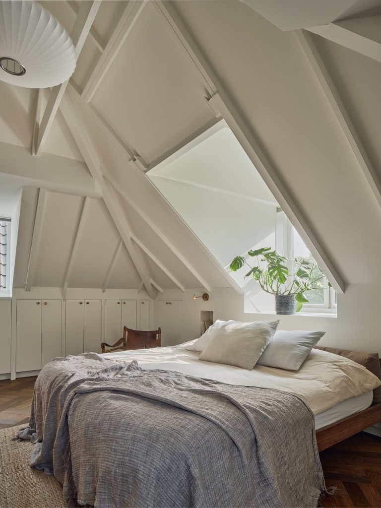 Dormitoarele (patru ) și băile aferente ocupă primul etaj și etalează o atmosferă luminoasă cu mult alb și elemente naturale. Atât parchetul herringbone, cât și detalii ale grinzilor originale ale acoperișului realizează legătura cu trecutul istoric al casei, sporind farmecul prezentului acesteia.