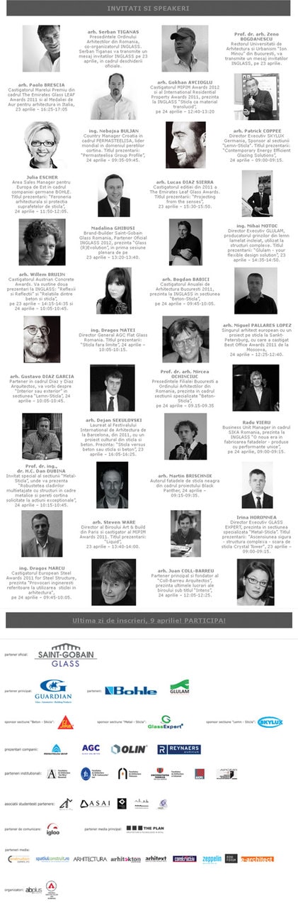 30 de arhitecţi, ingineri proiectanţi şi reprezentanţi ai liderilor din domeniul sticlei şi structurilor vor prezenta în cadrul celei de-a II-a ediţii INGLASS aplicaţii şi proiecte arhitecturale recente din Barcelona, Sankt-Petersburg, Bucureşti, Skopie, Berlin, Bruxelles, Madrid, Instanbul, Milano, Bilbao, Valea Doftanei, Paris, Viena şi Zagreb.