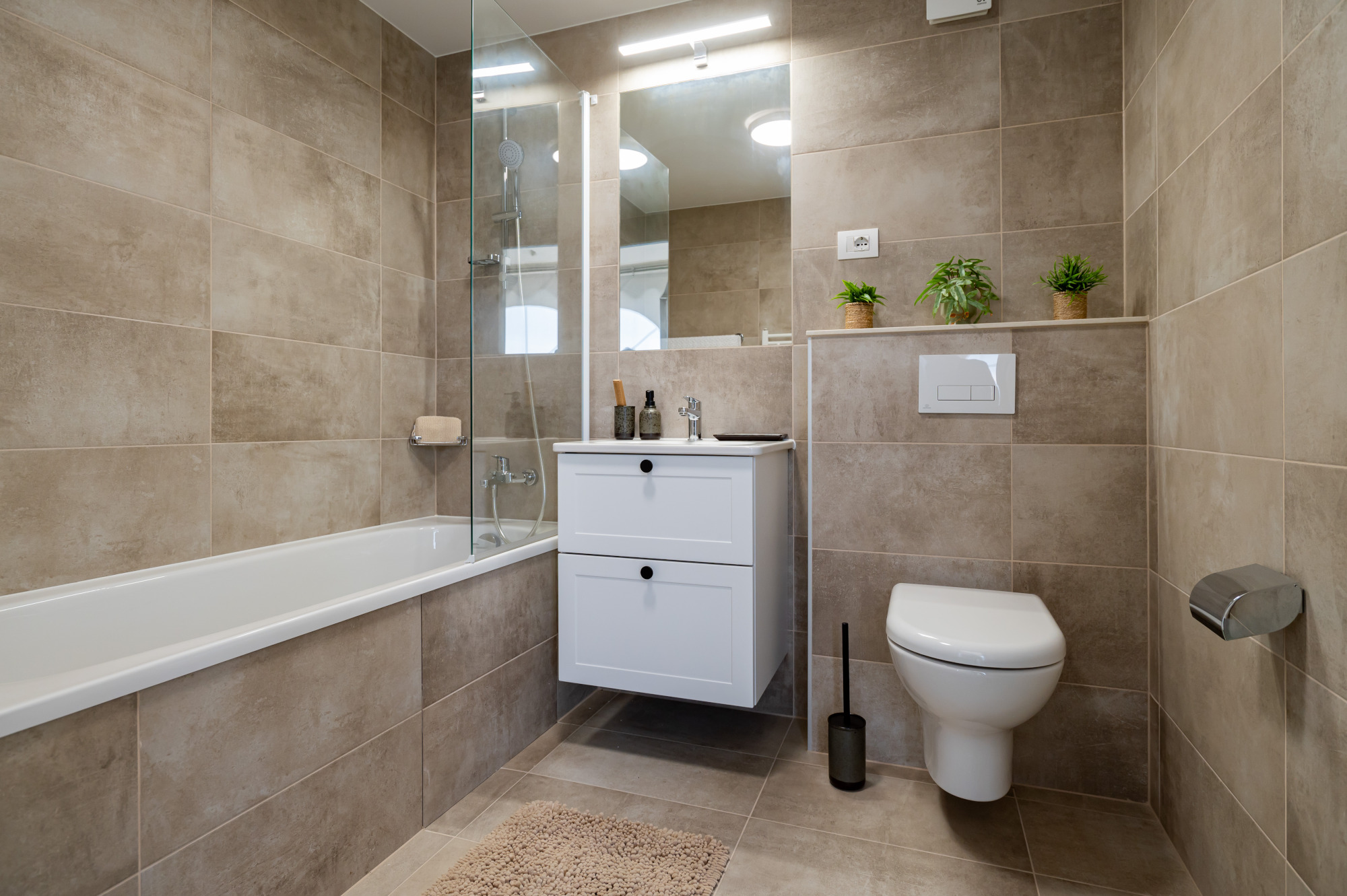 • Modulele vin complet echipate: obiecte sanitare Ideal Standard și Grohe, finisaje Ceramica Marazzi, accesorii INDA Hotellerie și instalații electrice eficiente energetic.
