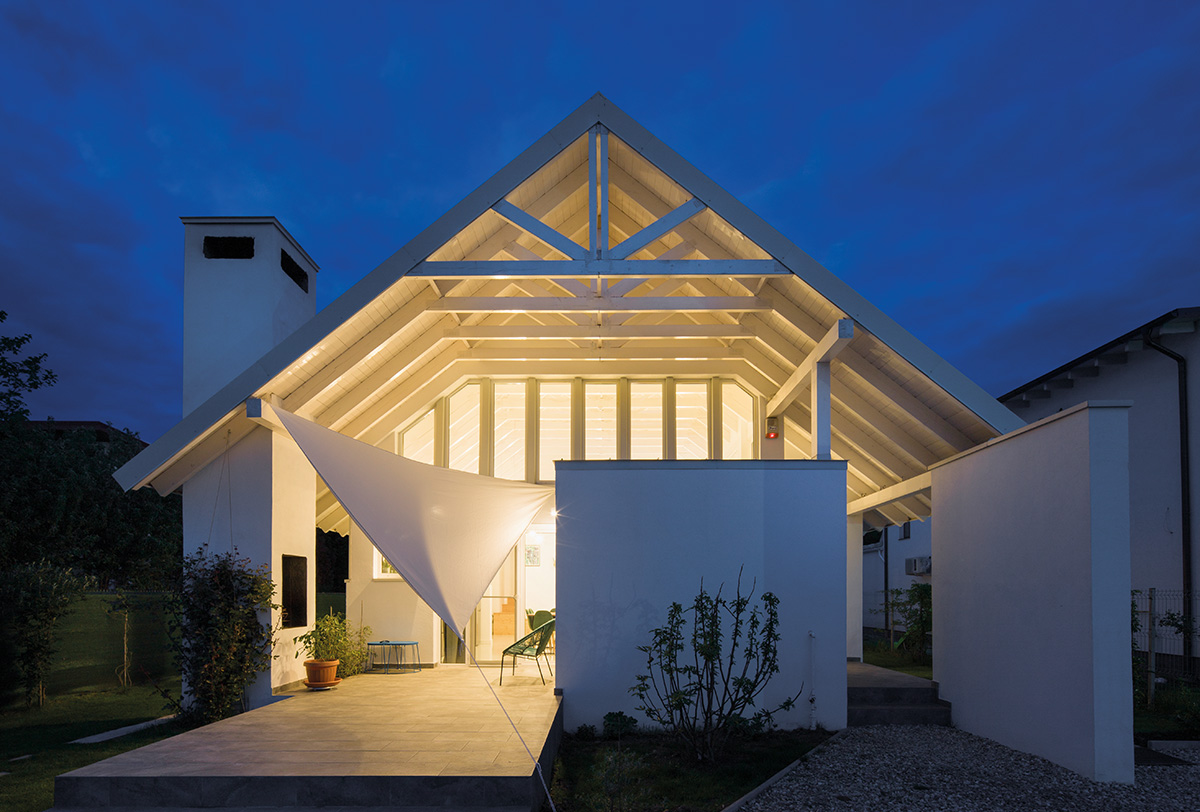 Rigurozitatea construcției acoperișului, cu repetiția grinzilor și a căpriorilor, definește atât interiorul, unde complexitatea acestor elemente este pusă în contrast cu simplitatea „cutiilor” de locuit, cât și exteriorul, unde dispunerea lor radială capătă un caracter solar, creând o senzație de ușurătate. Astfel, pentru că imaginea interioară a casei reflectă clar structura și construcția acoperișului, arhitecții au optat pentru așezarea termoizolației peste astereală, o soluție ingenioasă și economică.