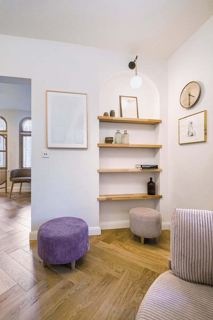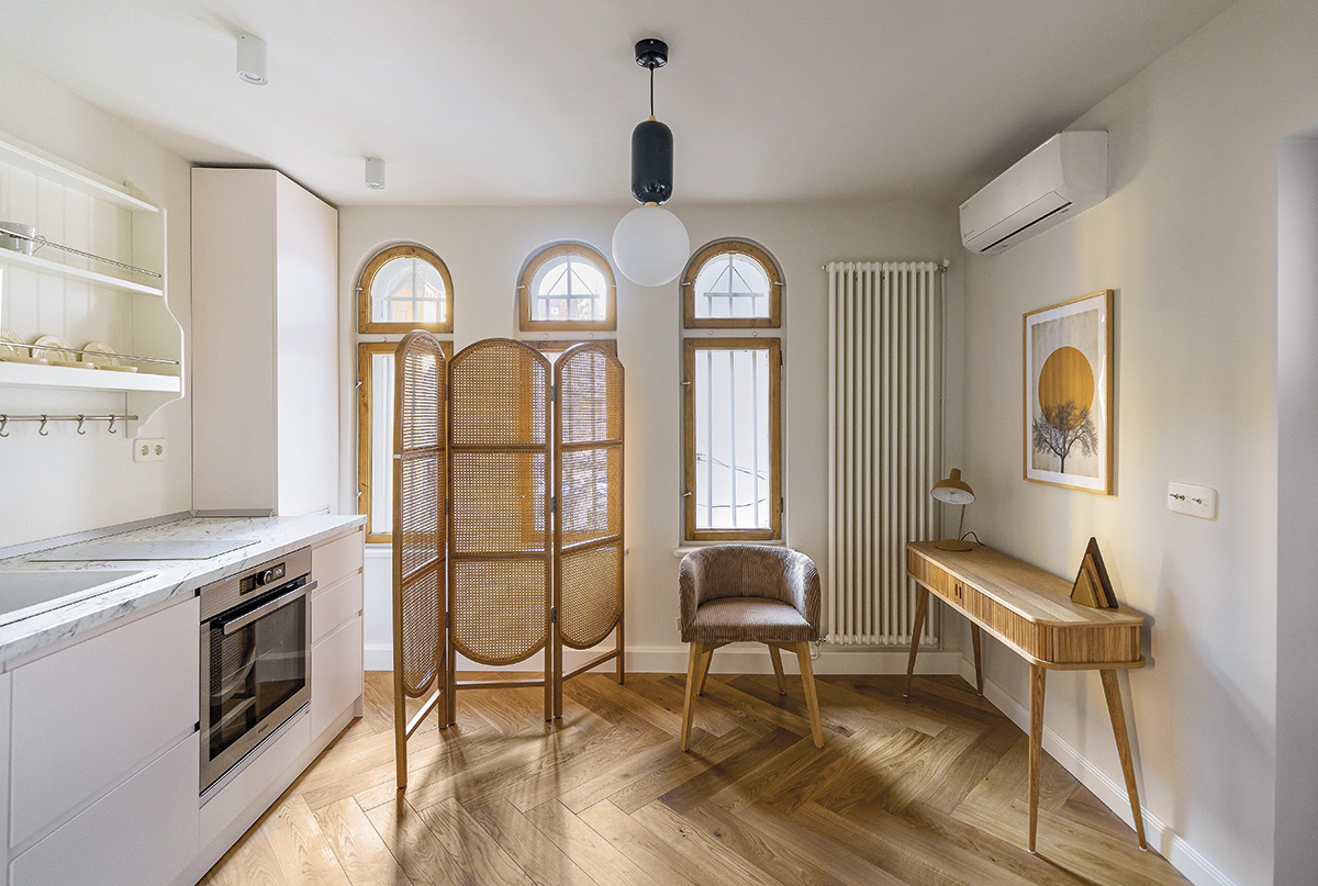 Un element distinctiv al proiectului îl reprezintă vechile și frumoasele ferestre ale apartamentului, pe care Adela le-a restaurat exemplar în atelierul său din Brașov, The Wood Doctor, și a căror structură boltită a devenit laitmotiv al întregului concept de amenajare, regăsindu-se în câteva piese inedite de mobilier: biblioteca integrată în nișa arcuită, oglinda de pe hol – chiar o translatare, ca dimensiune și formă, a ferestrelor – și paravanul din lemn din bucătărie.