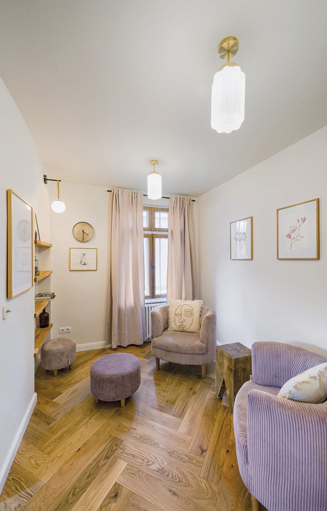 Proiectul Haga e o mică bijuterie (și cel mai mic apartament din album) ascunsă într-o casă veche bucureșteană cu elemente neoromânești – prilej pentru designerul Adela Chivărean de a lucra atent cu materia și de a salva tot ceea ce poate fi salvat și recontextualizat. Beneficiarii și-au dorit în primul rând un spațiu confortabil de lucru, care să nu excludă însă scenariul locuirii.