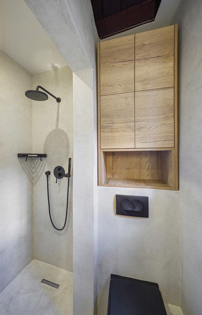 Asta a impus o recompartimentare și intervenții majore asupra instalațiilor și finisajelor. Prin noua configurație s-a creat un spațiu deschis pentru o mini-bucătărie și un birou, iar o porțiune din baie a intrat în componența unei camere. Au rezultat, așadar, două încăperi subtil delimitate (bucătărie și zonă de lucru) și o baie cu loc de duș.