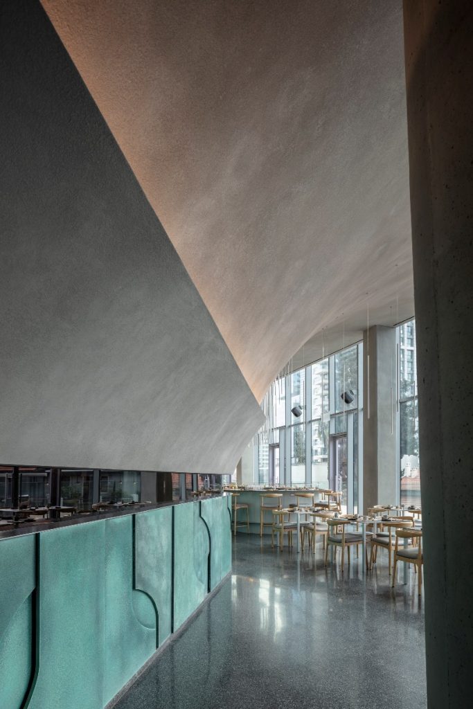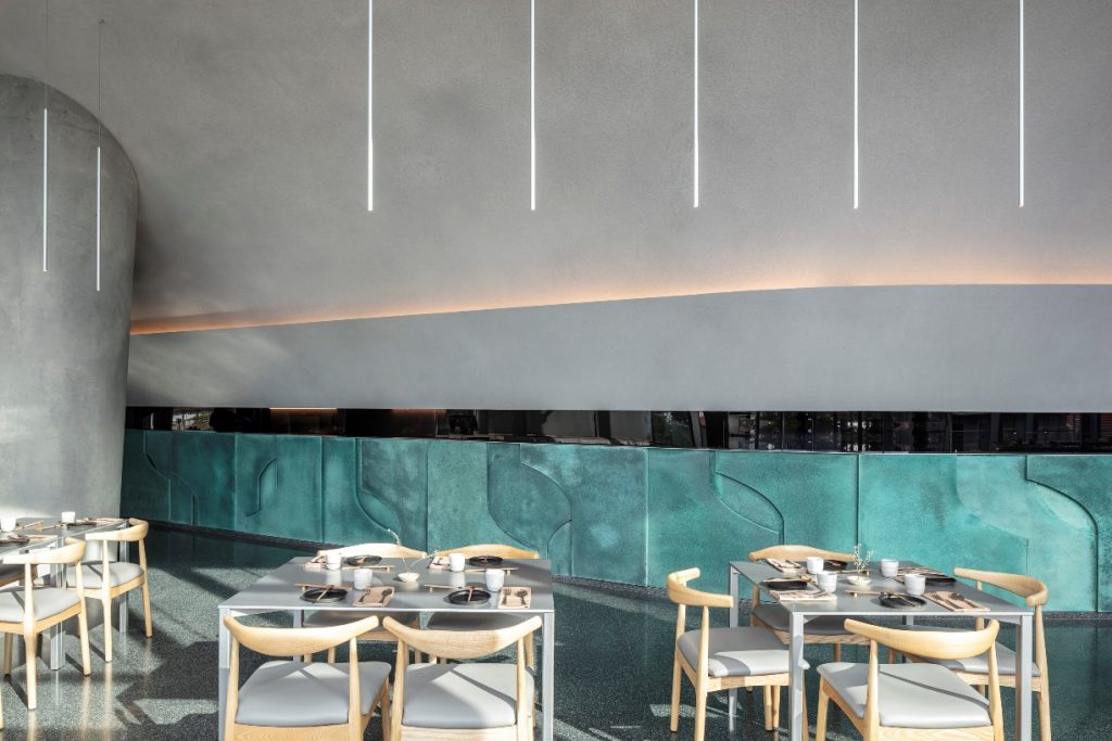 În ceea ce priveşte schema cromatică, predominante sunt nuanțele calde de gri preluate din limbajul arhitecturii moderne japoneze, cu structurile sale de beton. Turcoazul de cupru și lemnul scaunelor de sufragerie aduc accente de culoare în spaţiu, iar podeaua gri terrazzo introduce un strop de verde şi amintește de materialitatea europeană, în acelaşi timp făcând referire la moștenirea locală.