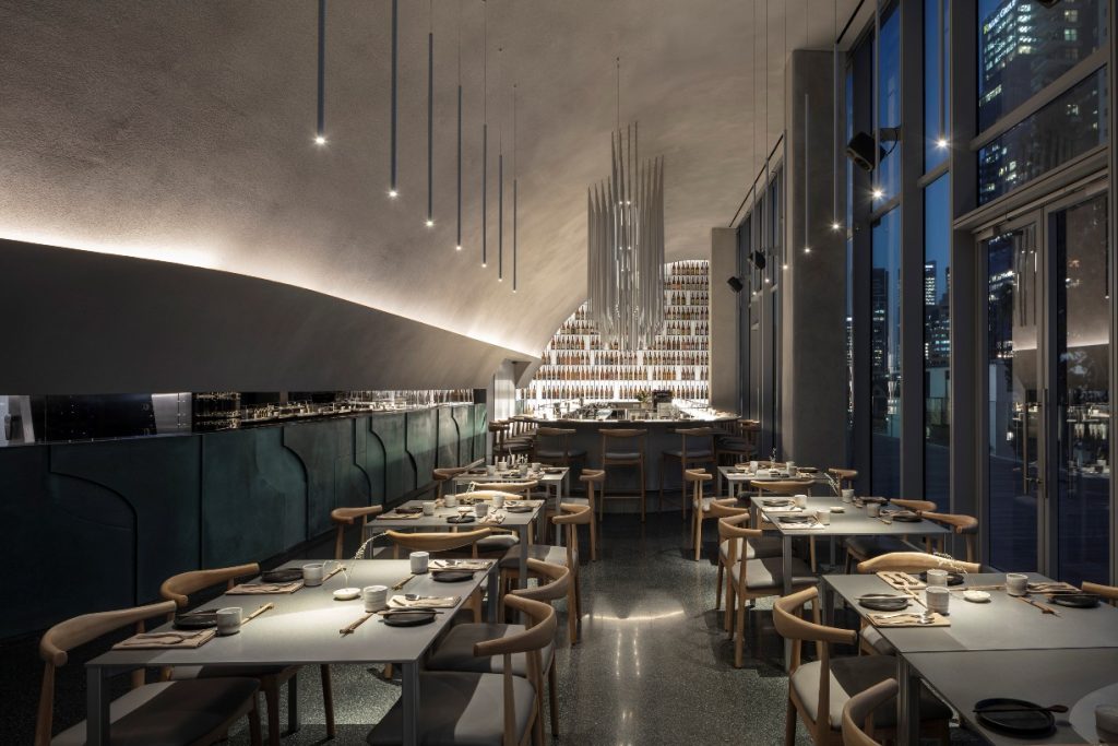 Capătul de perspectivă este vitrina din aluminiu periat în care sunt expuse sticlele de sake, ce ocupă întreaga înălţime a spaţiului și funcționează ca fundal pentru barul central al restaurantului. Mesele sunt proiectate în acelaşi limbaj cu placările patinate, fiind realizate din plăci de aluminiu cu dublu finisaj. Spaţiul privat definit de peretele curb de la intrare este dotat cu o masă supradimensionată, ce poate fi extinsă pentru a găzdui până la 20 de persoane.