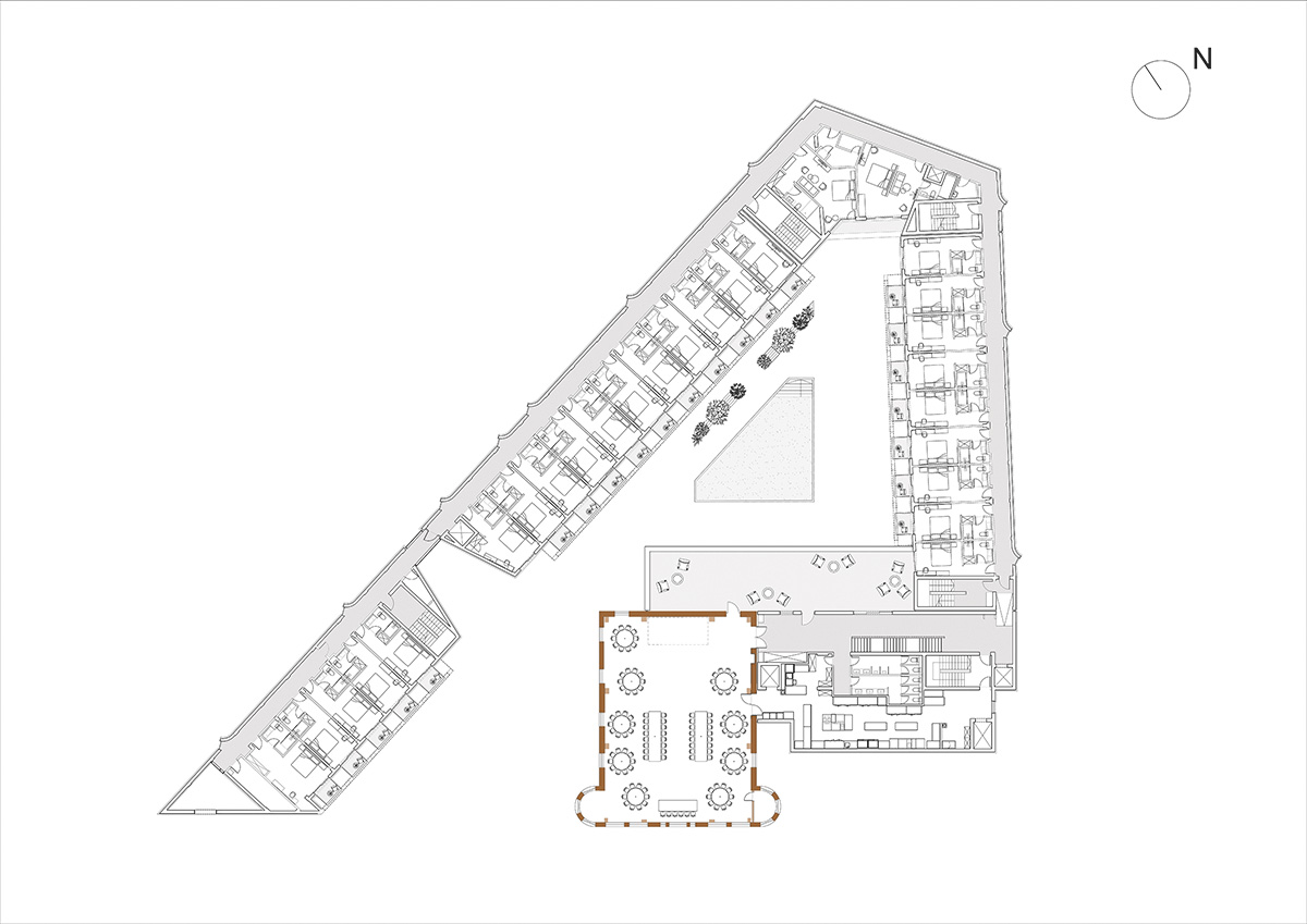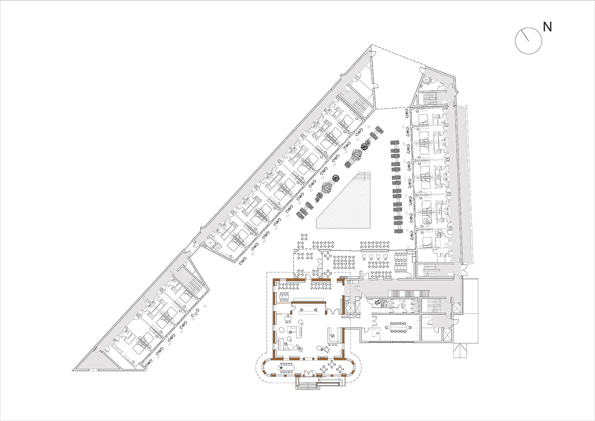Atât beneficiarii, cât și arhitecții și-au dorit conservarea valorilor specifice stilului brâncovenesc, spre exemplu, prin conservarea cărămizii autentice și utilizarea celei recuperate în cadrul balcoanelor la unitățile de cazare. Curtea interioară își concentrează direcțiile de circulație pe zona piscinei către care sunt orientate și toate suprafețele vitrate ale unităților de cazare, asigurând astfel o binevenită intimitate. Arcada a devenit elementul definitoriu al noului program, astfel că arcele porticului noilor clădiri au preluat arcadele clădirii Podgoreanu.