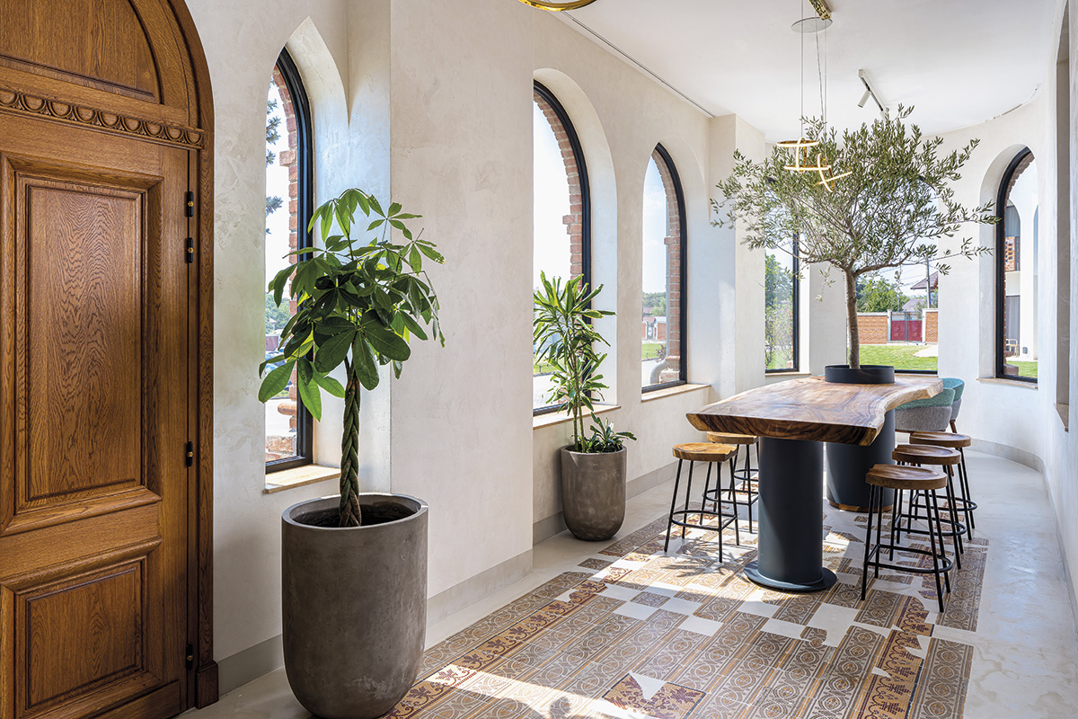 Reîntâlnim motivul arcadei și la interior în zona recepției și a spațiului de așteptare, în forma arcadei din cărămidă aparentă completată de „placarea metalică a intradosului arcelor”. Acestea sunt armonios completate de noi detalii și teme ale designului de interior, care asigură atât un ambient cald și primitor, însă fac și o trimitere subtilă la specificul locului (tipare geometrice ce amintesc de veșmintele populare, referințe vegetale în cazul corpurilor de iluminat și scaunelor etc.).