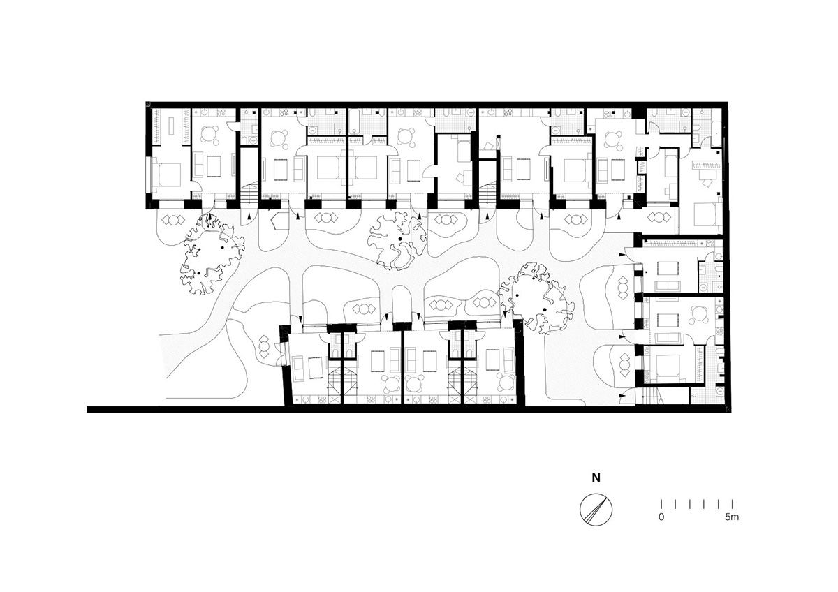 Complexul cuprinde apartamente tip studio, duplexuri de dimensiuni mici, dar și unități de locuit mai generoase, cu terase și balcoane cu balustrade din fier forjat. Grădina rămâne, însă, elementul unificator, cu un rol crucial în crearea atât a unei estetici domestice armonioase, cât și a unui sentiment de comunitate, susținut și de elemente precum ferestrele generoase de la parter, cu pervazuri joase și late din beton, ce pot servi drept locuri de ședere în zilele calde de vară, sau terasele mici acoperite cu pietriș pe care se poate așeza mobilier de exterior.