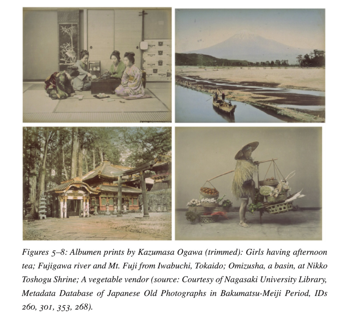 Studii recente [2], cu accent pe arhitectură, reconstituie și analizează atent cronologia și metamorfozele noilor contacte dintre Japonia și Occident, începând cu a doua jumătate a secolului al XIX-lea, când tot mai mulți călători străini vizitează țara, scriu despre ea sau o documentează fotografic. Ce se observă însă, deloc surprinzător, e cum întâlnirea nemijlocită cu pământul nemaivăzut rămâne deseori captivă acelorași vechi reflexe și imagini pitorești, în ciuda realităților concrete. Însuși arhitectul Frank Lloyd Wright, avid colecționar și pasionat cunoscător al artelor și arhitecturii japoneze tradiționale, va declara în anii ’30, chiar și după ce trăise și lucrase în Japonia, că oriunde se uită în noul Tokyo vede tot vechiul oraș, Edo, de secol XVIII, și că arată „exact ca în stampe” [3]. Alteori, în schimb, impactul acestor reprezentări idilice care circulau în Vest era atât de puternic și de durabil în mentalul colectiv, încât experiența unei vizite pe viu în Japonia se dovedea, inevitabil, sub așteptări. [4]