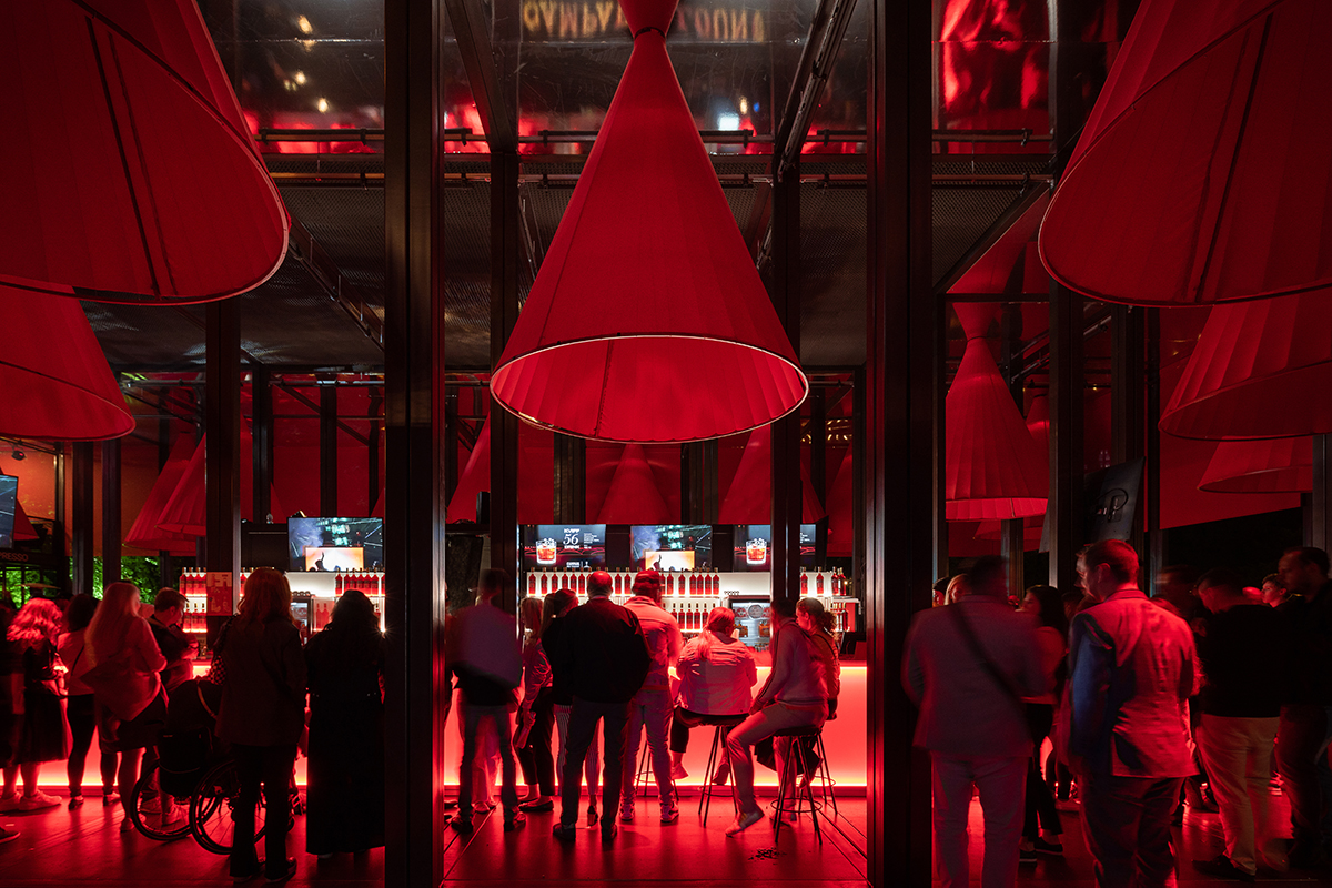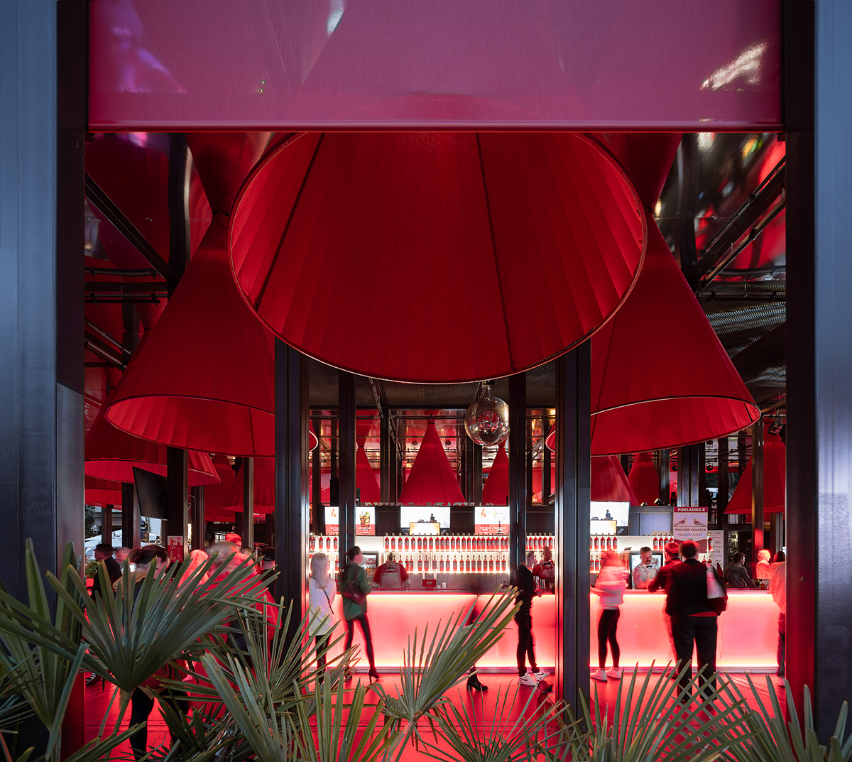 În schimb, culoarea și aspectul brut al structurii din oțel, precum și roșul intens al mobilierului trimit la arhitectura brutalistă a vecinului imediat, hotelul Thermal, construit între 1967 și 1976 de cuplul de arhitecți Věra și Vladimír Machonin. Astfel, pavilionul devine o extensie temporară a acestei clădiri reprezentative pentru arhitectura modernă din centrul și estul Europei.