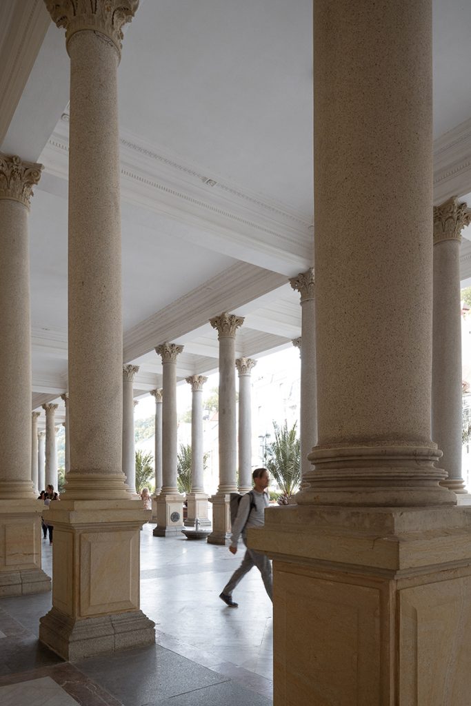 Deși o structură temporară, pavilionul are un aer atemporal, respingând aspectul dispozabil în favoarea eleganței care nu ține cont de schimbarea tendințelor. Pentru construcție s-au folosit module ajustabile pe înălțime, care generează o zonă spațioasă, cu colonade, inspirată de specificul arhitecturii balneare de secol 19 a celebrei stațiuni cehe.