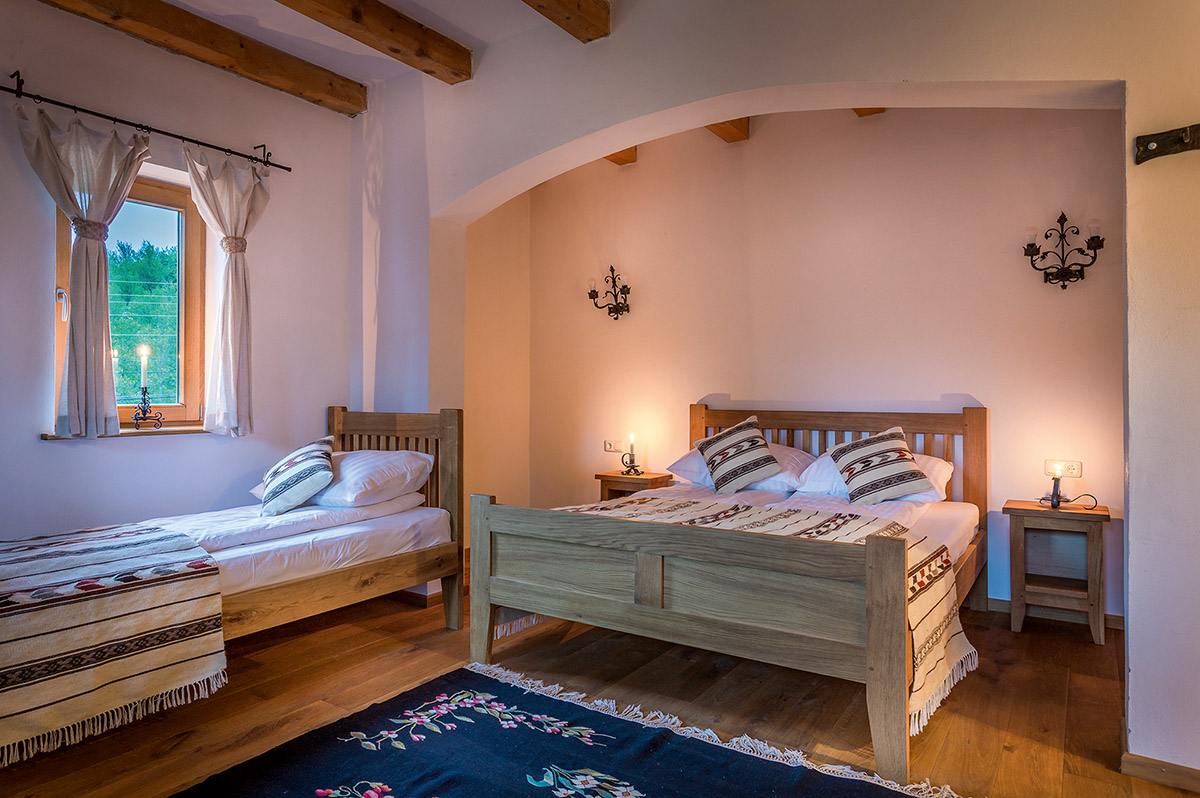 În decorarea cu miez tradițional a camerelor au fost invitați să contribuie meșteri locali – tâmplari, fierari, țesătoare – și nu lipsește nici ceramica de Horezu. De altfel, la Hanul Vatra se pot descoperi inclusiv creațiile meșterilor populari din Costești. Terasa casei se deschide în mod privilegiat către un pârâu și spre munte, iar restaurantul propune gusturi autentice bazate pe ingrediente locale. De la Hanul Vatra calea este deschisă pentru a descoperi Muzeul Trovanților, culele de la Măldărești sau atelierele de ceramică de Horezu, după cum am aflat din discuția cu Otilia Loidl.