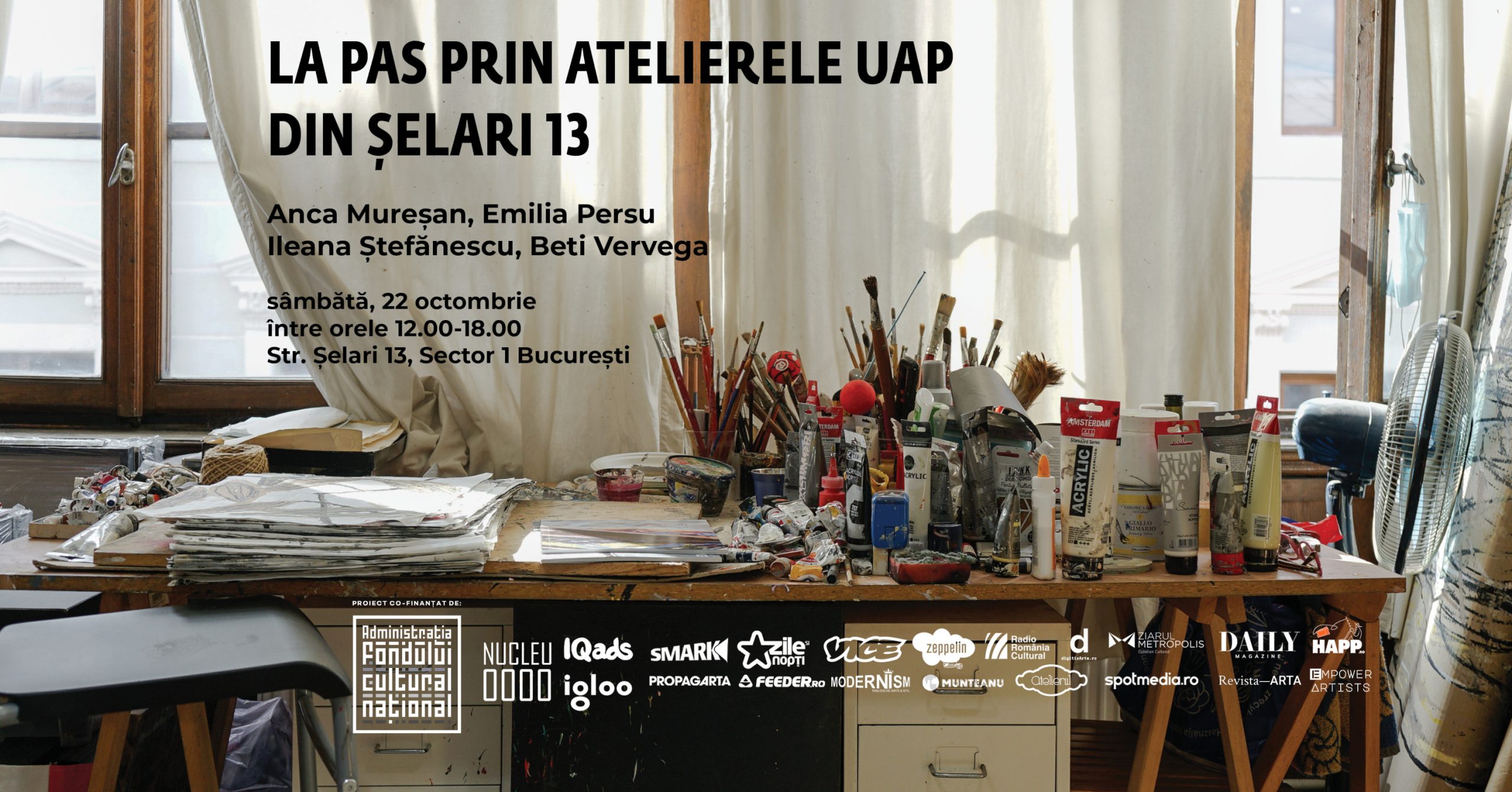 Patru noi ateliere își deschid porțile sâmbătă, 22 octombrie, în cadrul evenimentului „La pas prin atelierele UAP din Șelari 13”, o inițiativă a Asociației Nucleu 0000, care vizează familiarizarea publicului larg cu spațiile de creație din centrul Bucureștiului. Între orele 12.00-18.00, artiștii Anca Mureșan, Emilia Persu, Ileana Ștefănescu și Beti Vervega își așteaptă vizitatorii, public de specialitate și iubitori de artă deopotrivă, în lumi personale, cu pânze și culori, dar mai ales cu idei și concepte despre arta contemporană. În același interval orar, în Galeria Atelier 35, care se află la parterul clădirii de ateliere din Șelari 13, va putea fi vizitată expoziția Nucleu 0010. Întâlniri inoportune (artiști: Roberta Curcă, Alexandra Ivanciu, Diana Miron, Marina Oprea, Nicolae Comănescu, Anca Mureșan, Beniamin Popescu și Elena Scutaru).