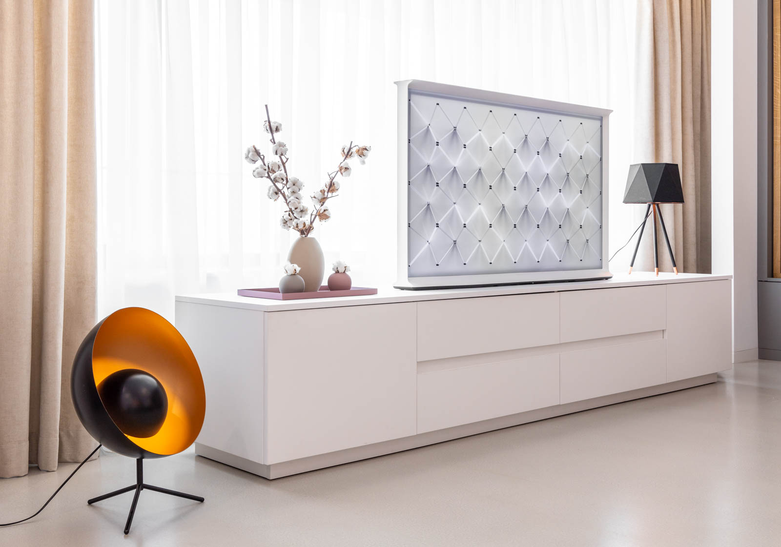Riflajele glisante din lemn masiv prezente în living se potrivesc perfect cu rama unică, sub forma literei „l” a Samsung The Serif, care, atunci când nu este folosit, se îmbină cu decorul asemenea unei piese de artă. Mai mult, atunci când este oprit, televizorul poate afişa o serie de cadre inspirate de frumuseţea naturii. Şi în acest caz, el se armonizează perfect cu textura lemnului sau cu tabloul cu zebre stilizate.