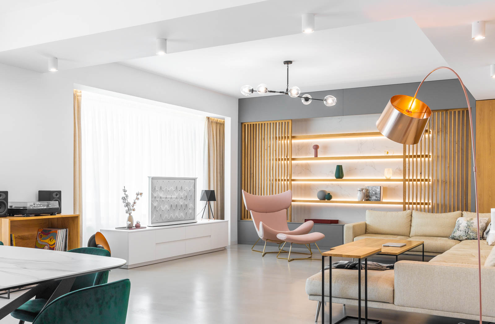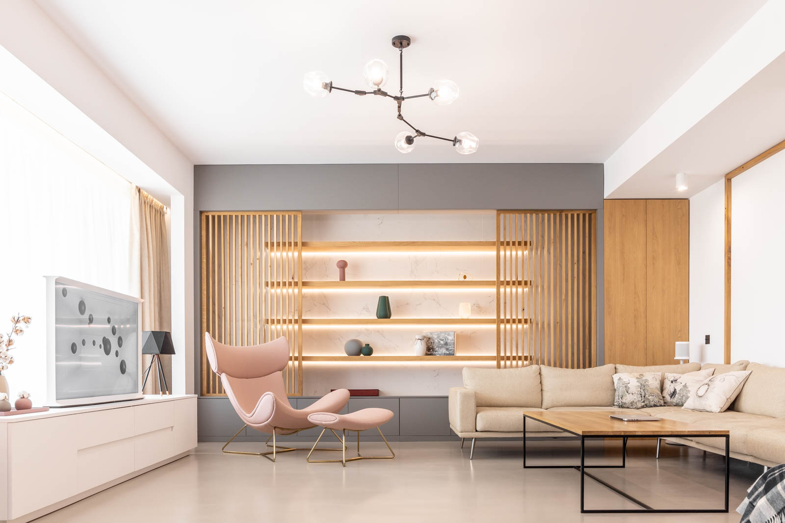 Responsabilitatea arhitectului este de a sculpta aerul”, spun cei de la Ateliero, iar acest lucru se simte cu adevărat în amenajarea acestui apartament spaţios, ce aduce o doză de minimalism scandinav cu note luxury în zona de nord a Bucureştiului. Dominat de tonuri neutre, calde şi de textura naturală a lemnului, pe alocuri în asocieri surprinzătoare, apartamentul „respiră” modernitate şi sofisticare şi se dovedeşte un mediu ideal pentru inovaţia şi designul unic concretizate în televizorul − piesă statement – Samsung The Serif.