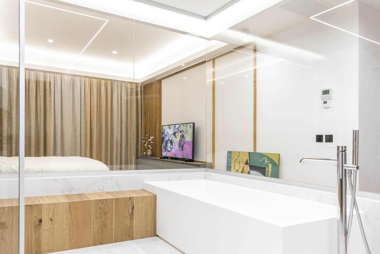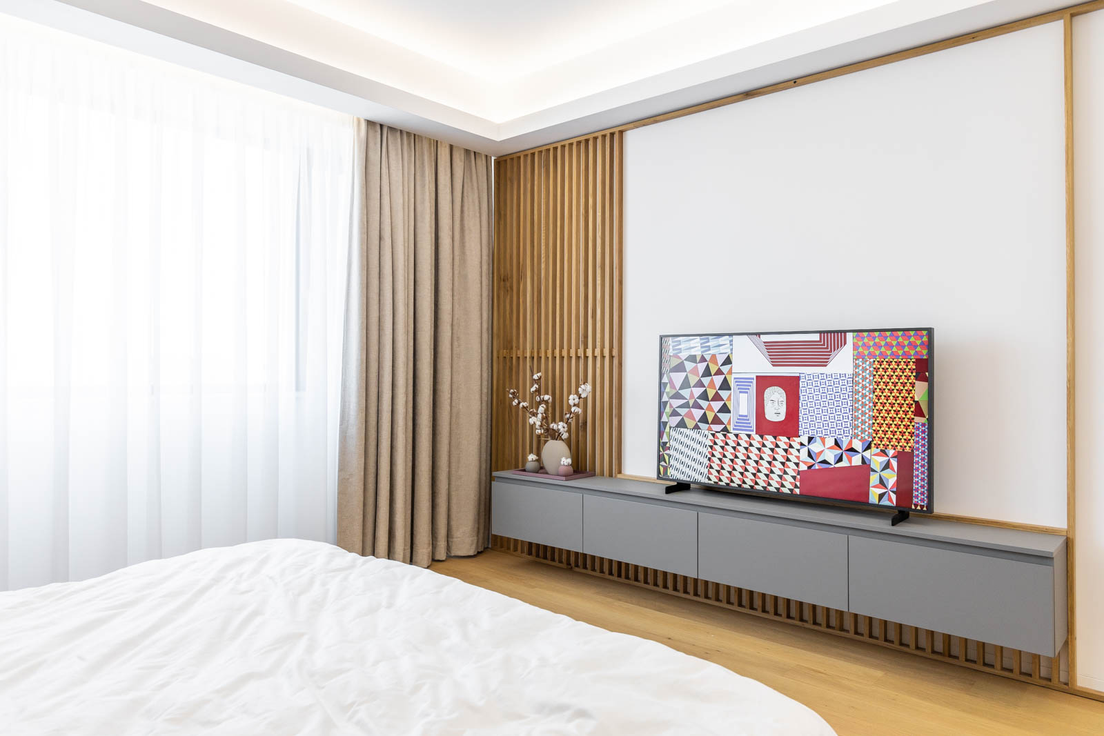 Televizorul din dormitor este tot Samsung, de data aceasta The Frame şi aduce, prin supleţea sa, o completare discretă, dar de efect, unui spaţiu caracterizat de un fascinant joc de texturi. Şi aici, dominant este lemnul, care se îmbină armonios cu tonurile calde de gri deschis.