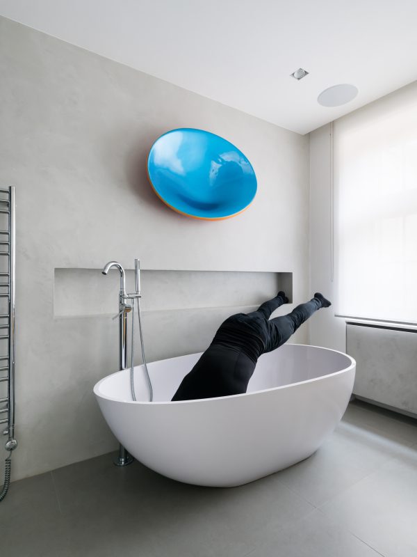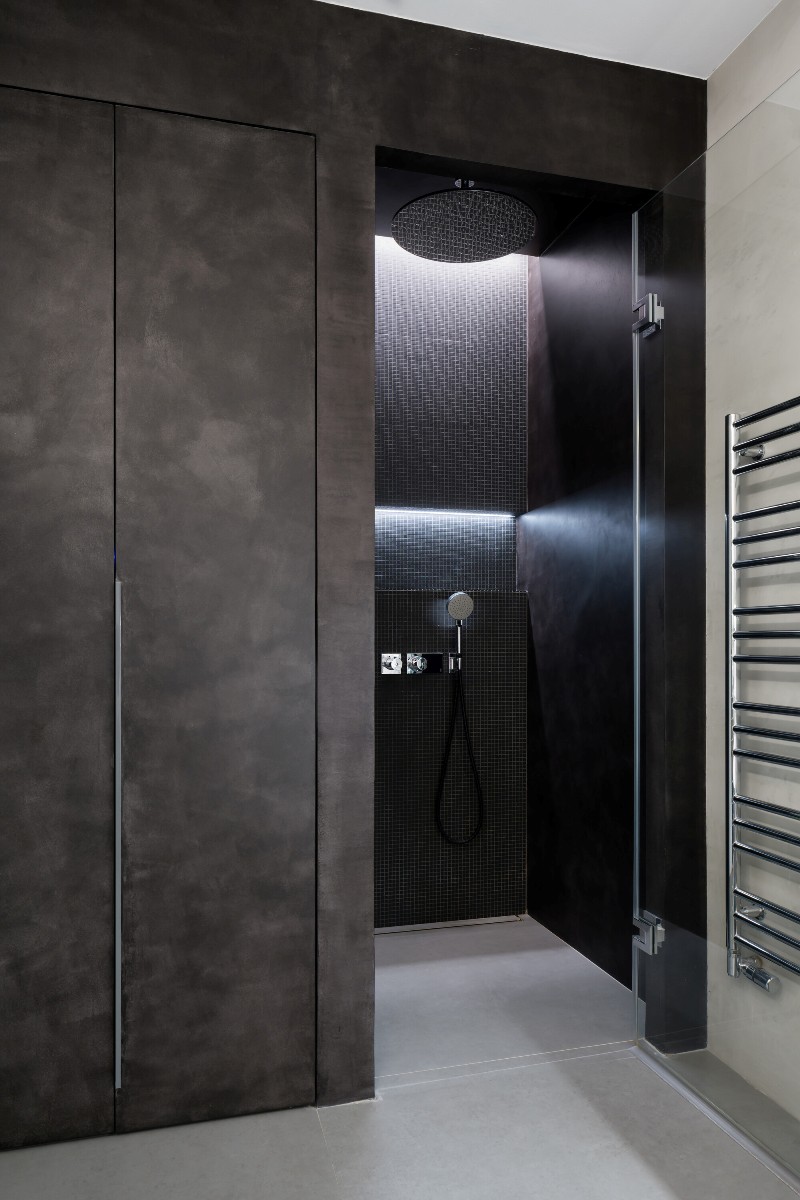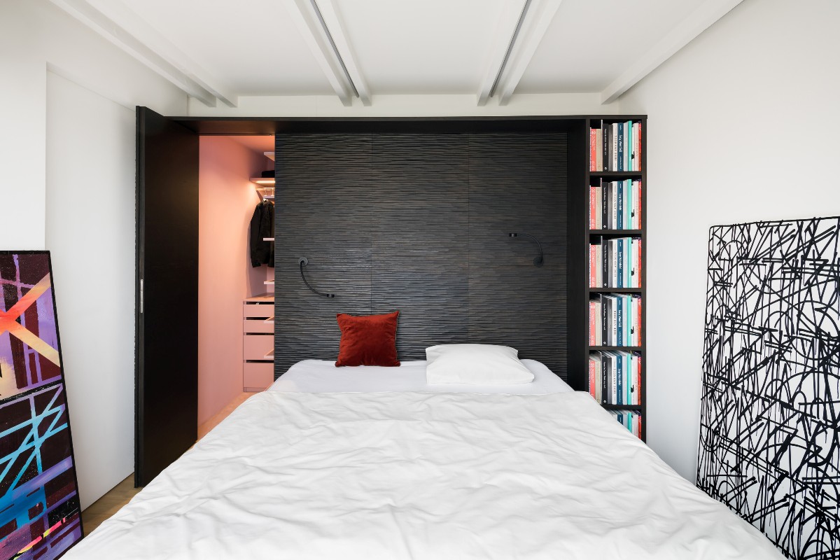 Zonele şi elementele din jurul livingului deschis amplasat central au fost simplificate, iluminate generos şi armonizate în aşa fel încât acesta să iasă în evidenţă, dar şi pentru a crea un fundal neutru, cu un minimum de detalii, care să pună în valoare operele de artă şi piesele de mobilier. Uşile interioare cu cadru „invizibil” au fost vopsite în alb, asemenea pereţilor în care sunt integrate. Baia principală apare ca un spaţiu de retragere auster, finisat cu ciment şi cu un perete de duş din mozaic în nuanţe de antracit.