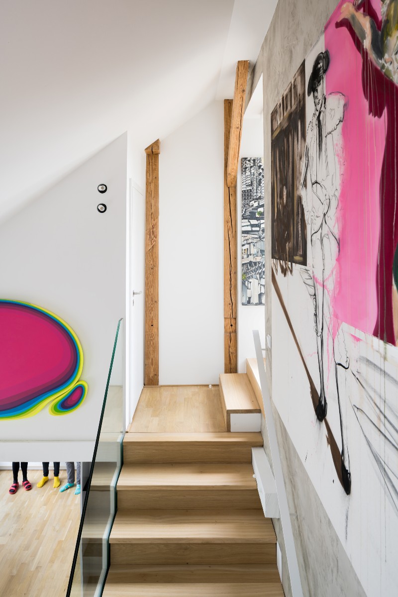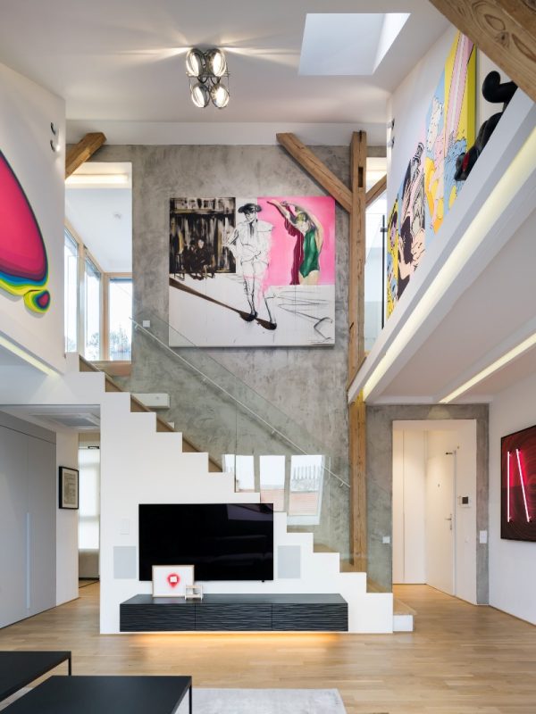 Bucuria jocului şi a descoperirii infuzează fiecare colţ din acest duplex cu atmosferă unică, ce ocupă ultimele două niveluri ale unui imobil construit în anii 1930 în cartierul Letna din Praga. Principala sursă de inspiraţie au fost înşişi beneficiarii, ale căror personalităţi şi gusturi non-conformiste se reflectă nu numai în lucrările de artă ce le populează spaţiul de locuit, dar şi în compartimentarea interioarelor şi în rezolvările surprinzătoare ale diferitelor zone.