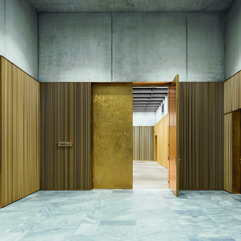 Claritatea organizării funcționale interioare este susținută de materialitate și lumină. Placările de calcar învelesc interioarele de beton, oglindind cadența orașului. Ritmul vertical al fațadei se citește ca un grid riguros, accentuat de culoarea placărilor de piatră care oferă un efect de profunzime. Elementele structurale aparente devin formula de conexiune vizuală între interior și exterior. Betonul, la interior, rămâne aparent și este accentuat cu marmură, lemn sau alamă. Spațiile au o atmosferă caldă și meditativă. Preocuparea pentru sustenabilitate a dictat alegerea materialelor, astfel că 90% din betonul folosit pentru structură este reciclat.