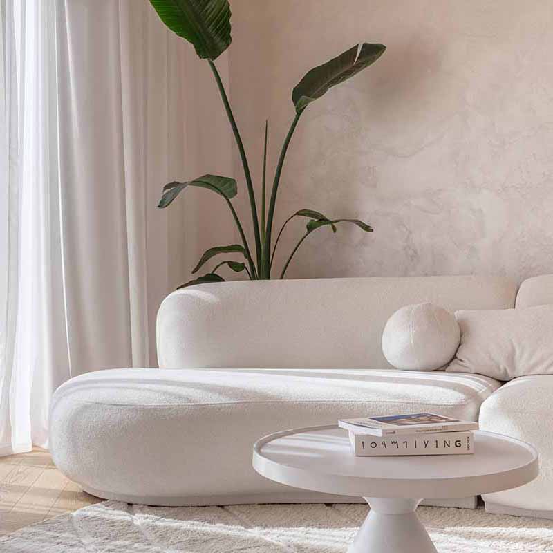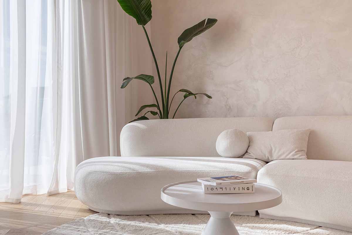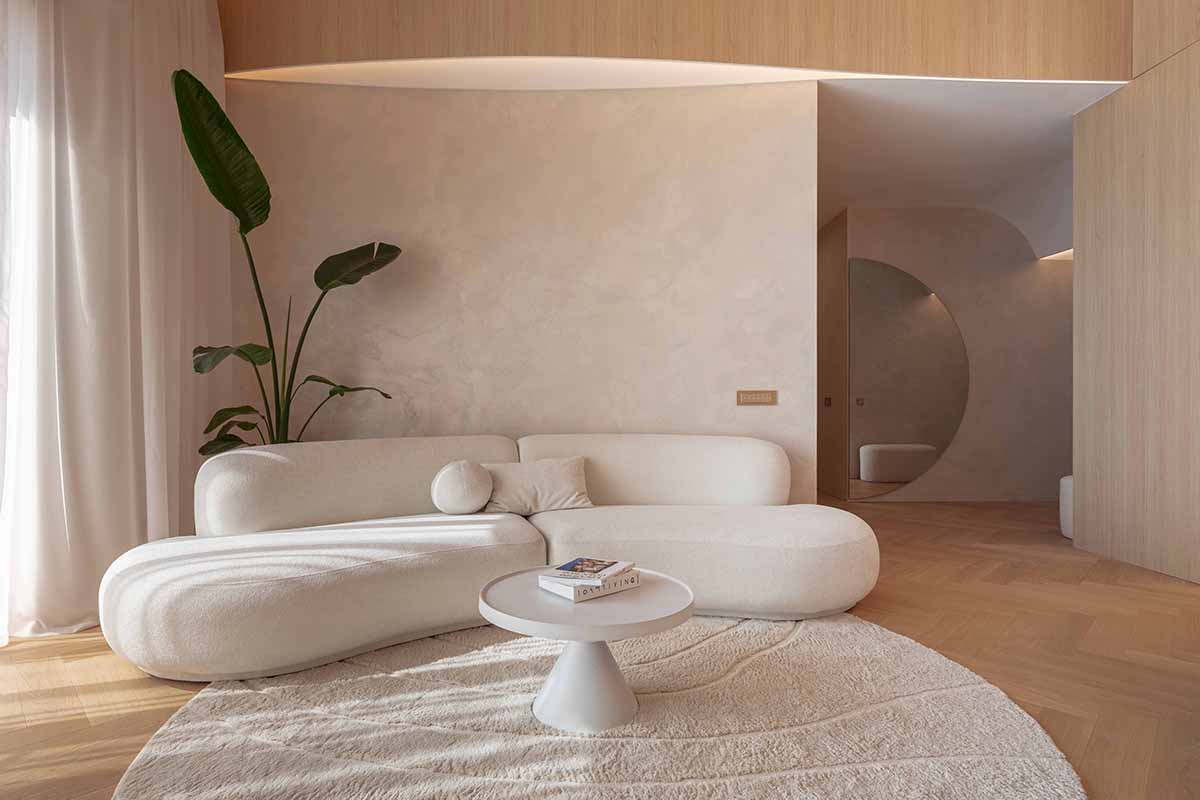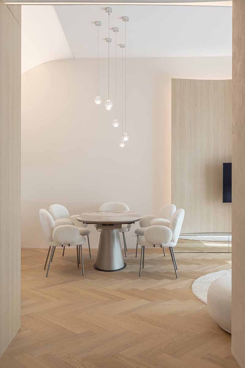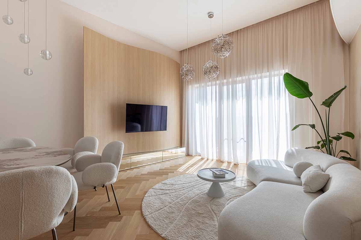 Înălțimea generoasă de aproape 4 m și vitrajele de mari dimensiuni permit zonei de zi să se bucure din plin de lumina naturală. Texturile naturale și nuanțele deschise pun în valoare caracterul sculptural al pieselor de mobilier, într-un cadru definit de complementaritatea suprafețelor curbe și plane. Această tensiune subtilă se manifestă prin elemente precum suportul ondulat al televizorului, jocul volumetric concav-convex din spatele canapelei, sau racordul luminos de barrisol care creează o continuitate între plafon și mobilierul de bucătărie și marchează spațiul de dining.