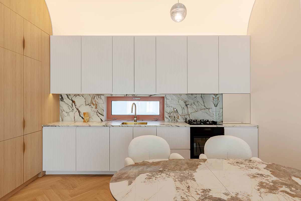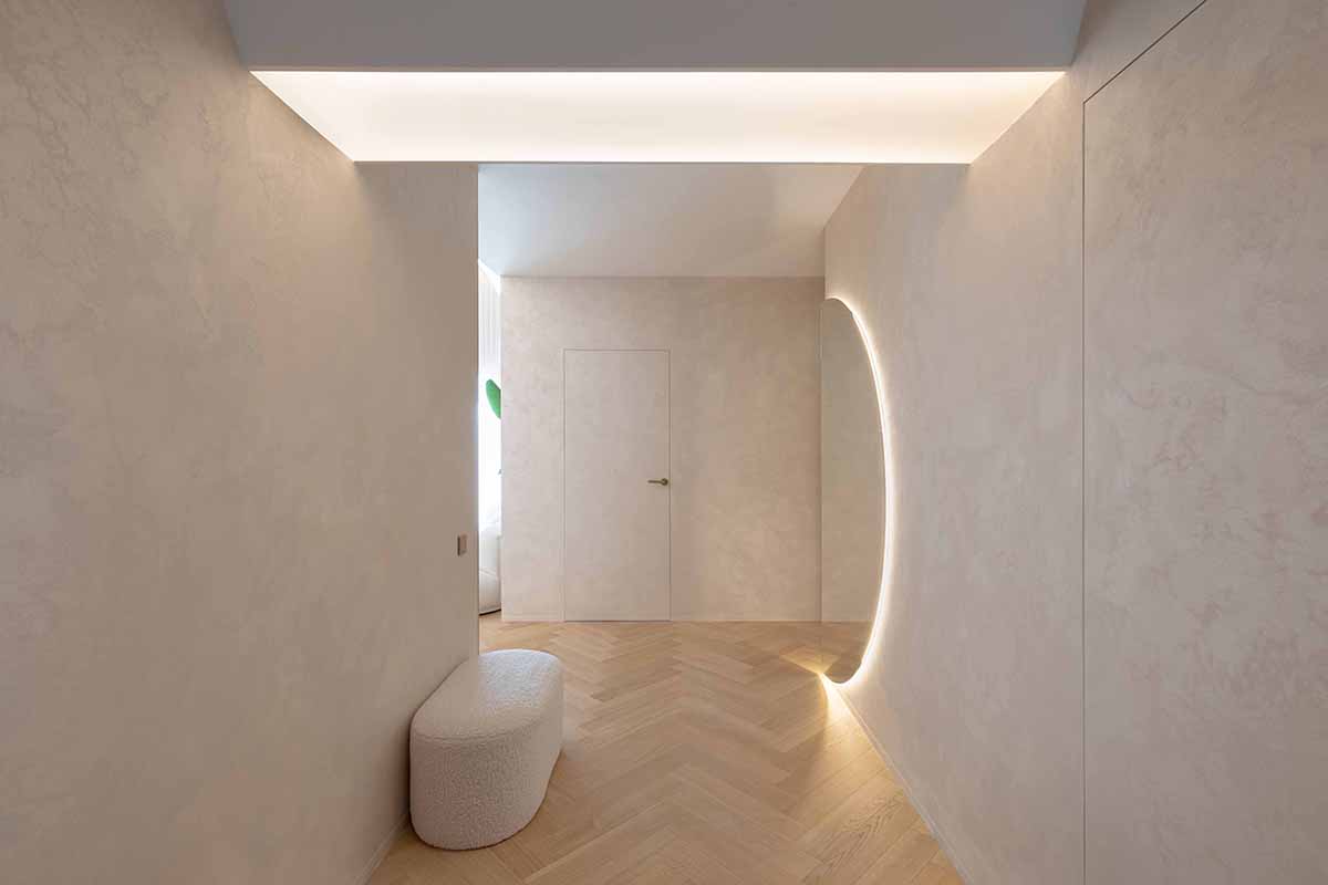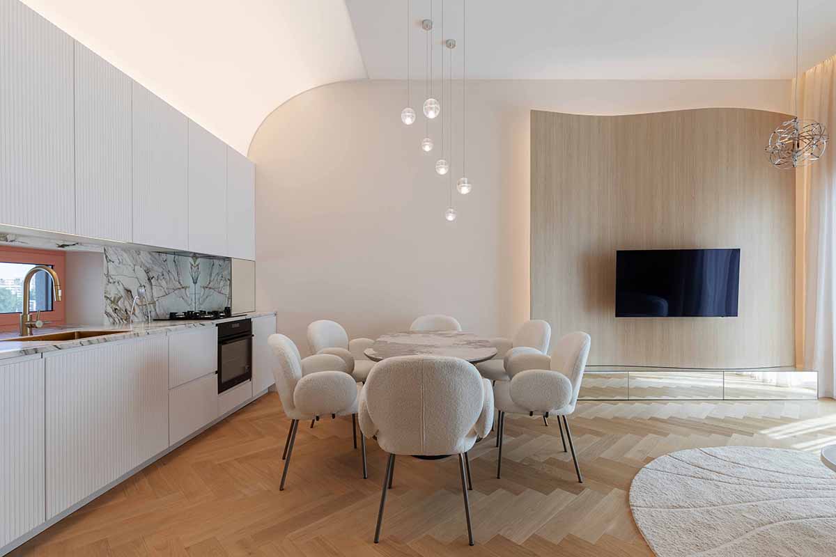 Orientarea favorabilă și spațiile înalte ale acestui apartament, situat la ultimul etaj al unui bloc recent construit în zona centrală a Capitalei, au permis crearea unei experiențe spațiale aparte, cu elemente sculpturale puse în valoare de lumina naturală abundentă și un parcurs fluid.