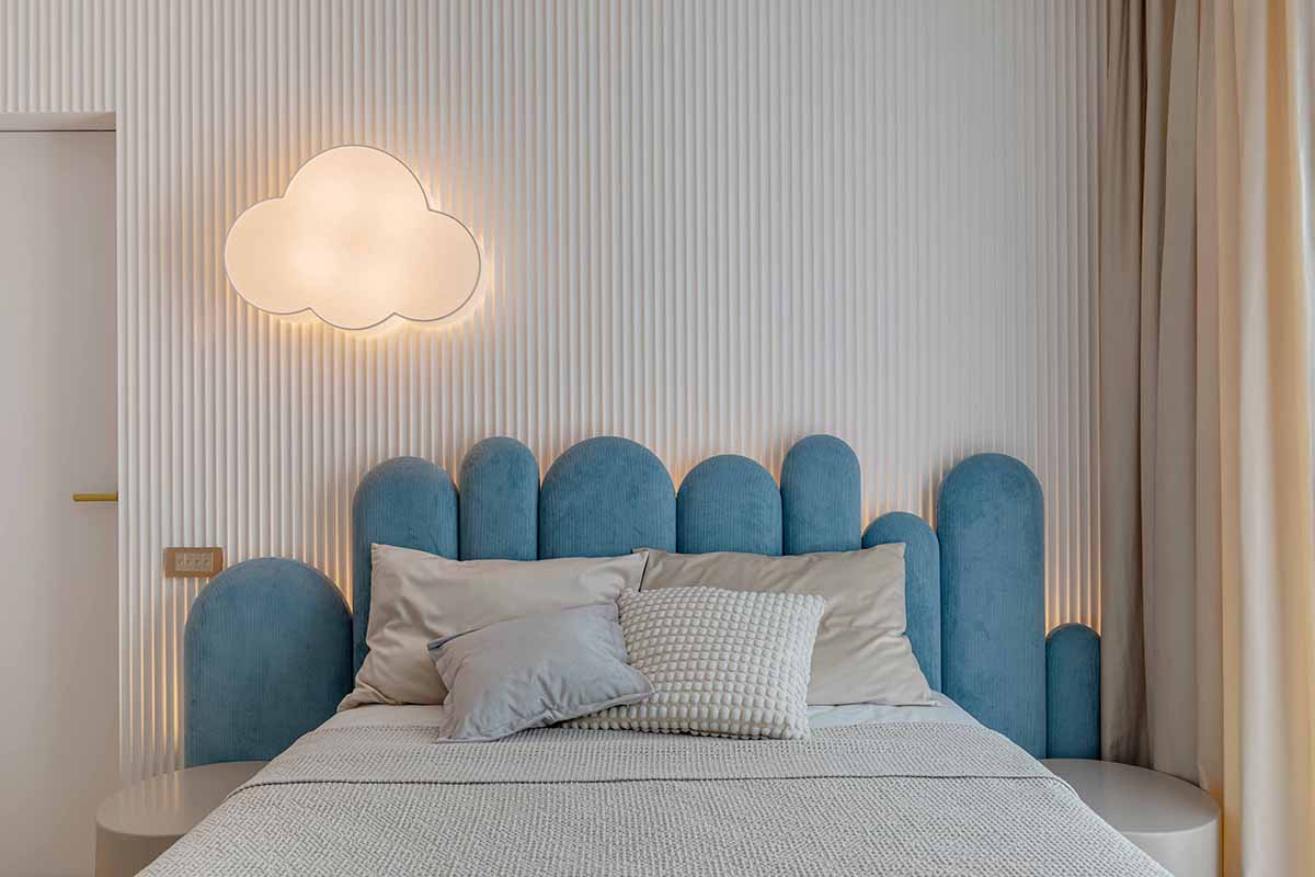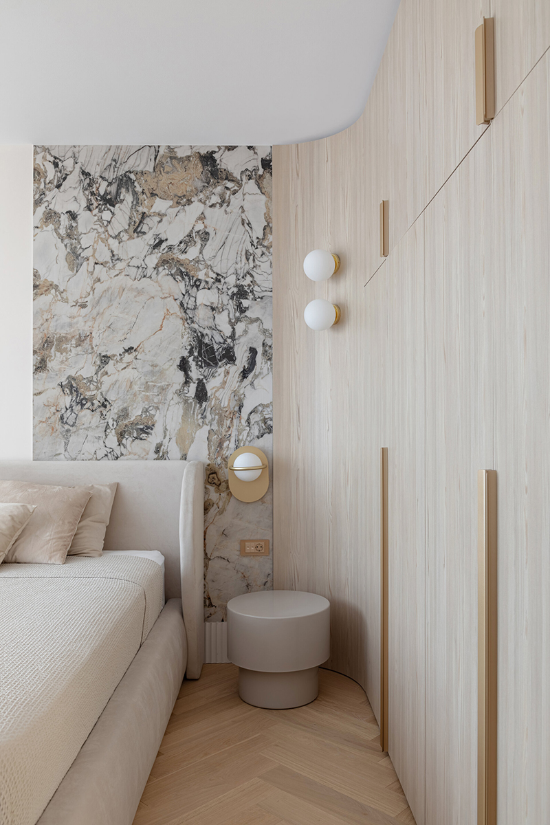 Dormitorul matrimonial reia jocul dintre suprafețele plane și cele curbate, cu precădere în cazul dressing-ului, ale cărui curbe sunt prezente de la intrarea în spațiu și se continuă pe întreaga lungime a peretelui, anulând colțul. În spatele patului, alăturarea fragmentară dintre piatră și lemn creează un fundal pictural.
