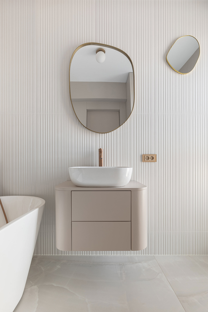 Cele două băi sunt amenajate într-un stil unitar, cu lastre de dimensiuni mari și plăci ceramice cu suprafețe ritmate. Nuanțele deschise ale placărilor sunt punctate de accente metalice aurii sau arămii.