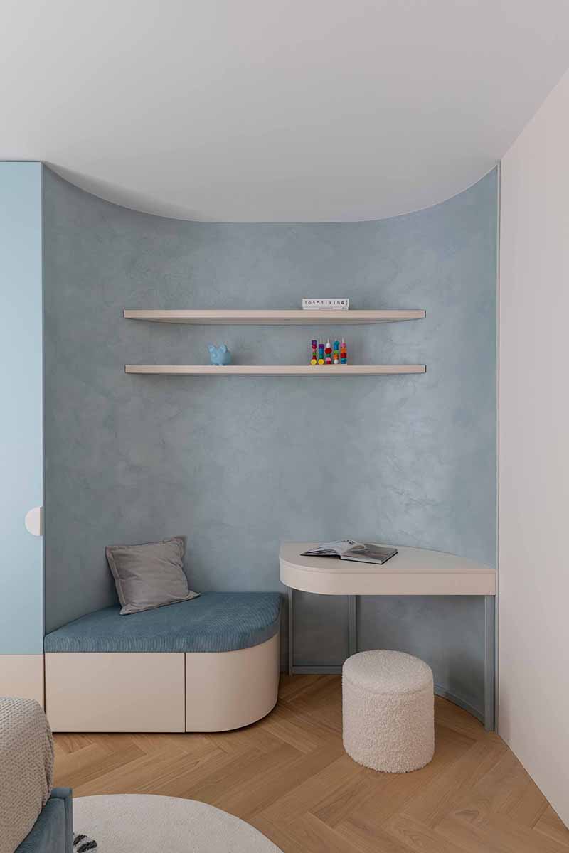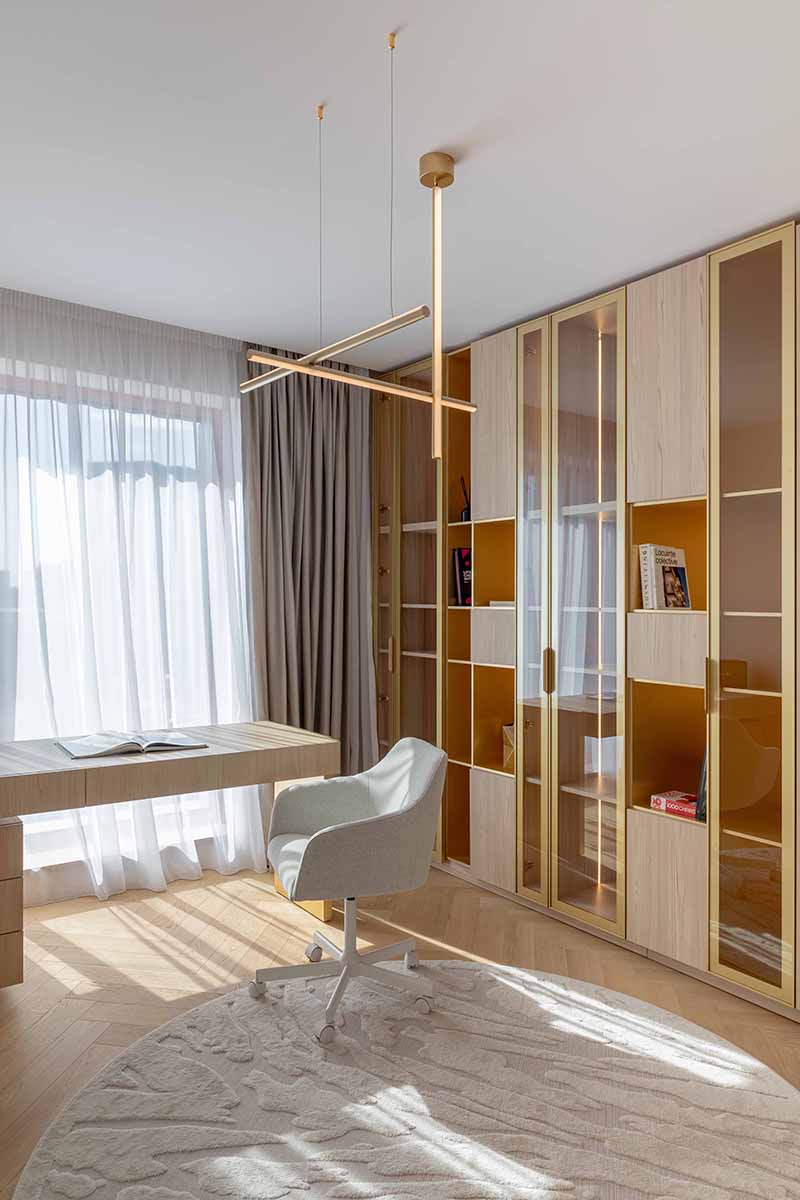 Amenajarea include și o zonă de home office, gândită pentru a ajuta la menținerea concentrării. Astfel, în contrast cu liniile ondulate, calme, ale zonei de living, acest spațiu este definit de o rigoare carteziană exprimată prin mobilier și corpurile de iluminat. Texturile naturale de lemn și accentele discrete de auriu sunt puse în valoare de abundența luminii de la vest.