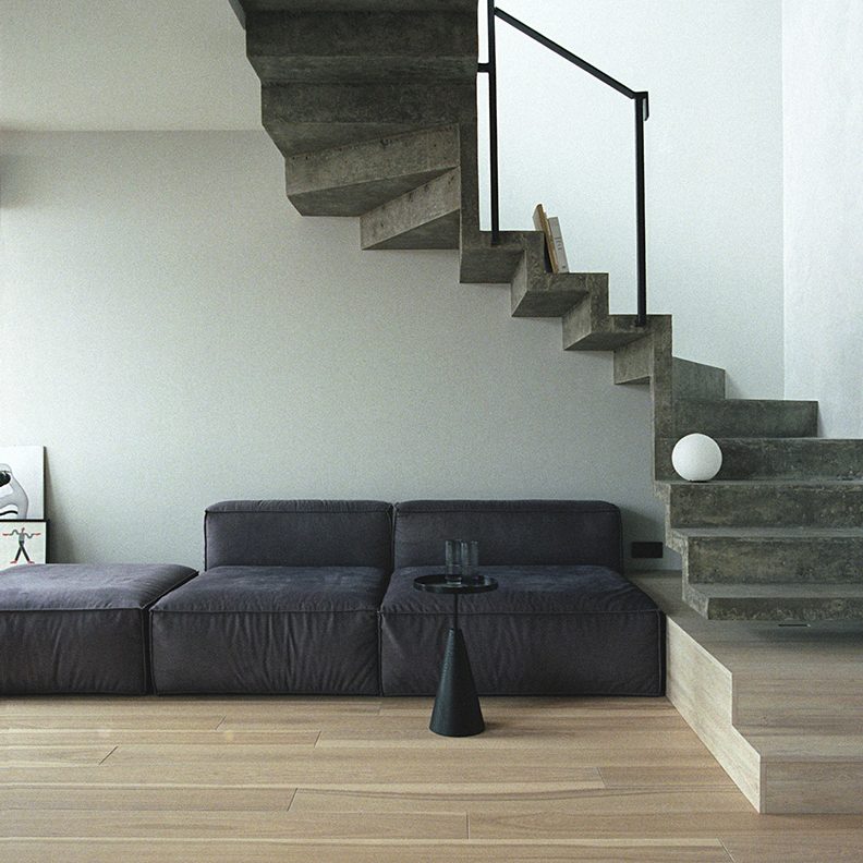 Duplexul a fost dinadins păstrat gol, deoarece simplitatea creează fundalul perfect pentru viața de zi cu zi, căreia nu îi impune niciun fel de termen. Prin urmare, spațiul așteaptă să fie umplut de personalitatea celui care îl va locui – idee exemplificată la propriu prin prezența, în dormitor, a unei nișe pentru tablouri, lăsată goală de arhitect.