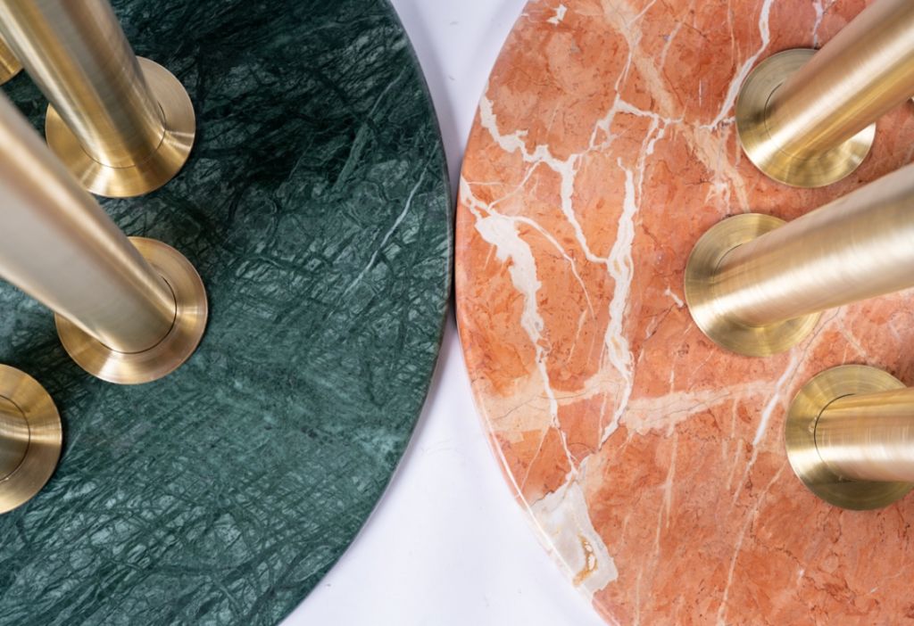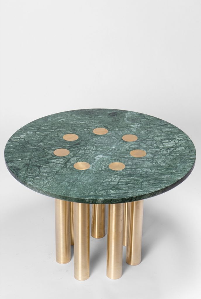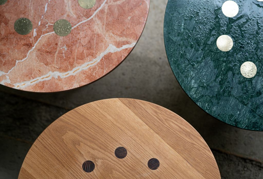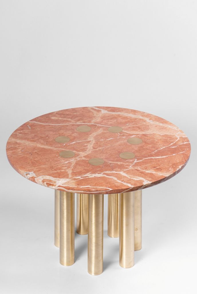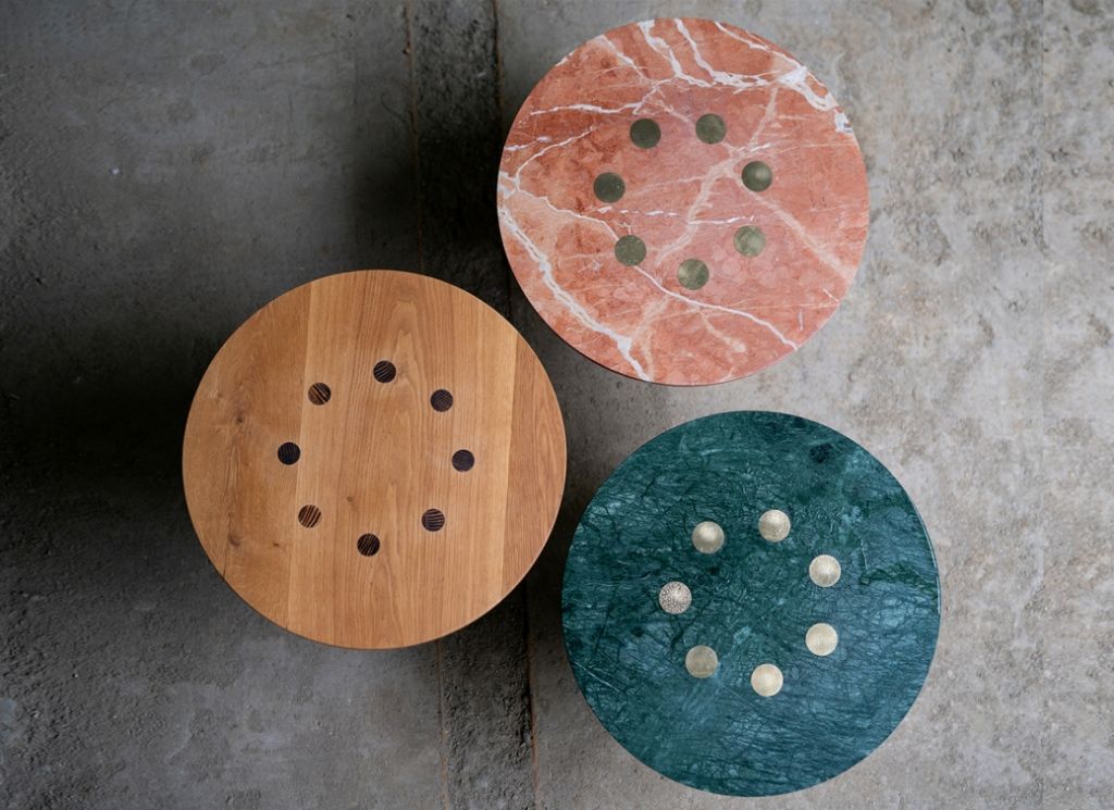 Fiecare masă este realizată din două materiale, unul pentru blat – marmură sau lemn de stejar, iar celălalt pentru bază – alamă sau lemn de molid -, iar cele două se intersectează pentru a forma piese unice, cu personalităţi proprii în cadrul aceleiaşi tipologii. Materialele sunt finisate prin şlefuire, în cazul meselor din marmură, şi cu ulei şi ceară naturală, în cazul mesei din lemn.