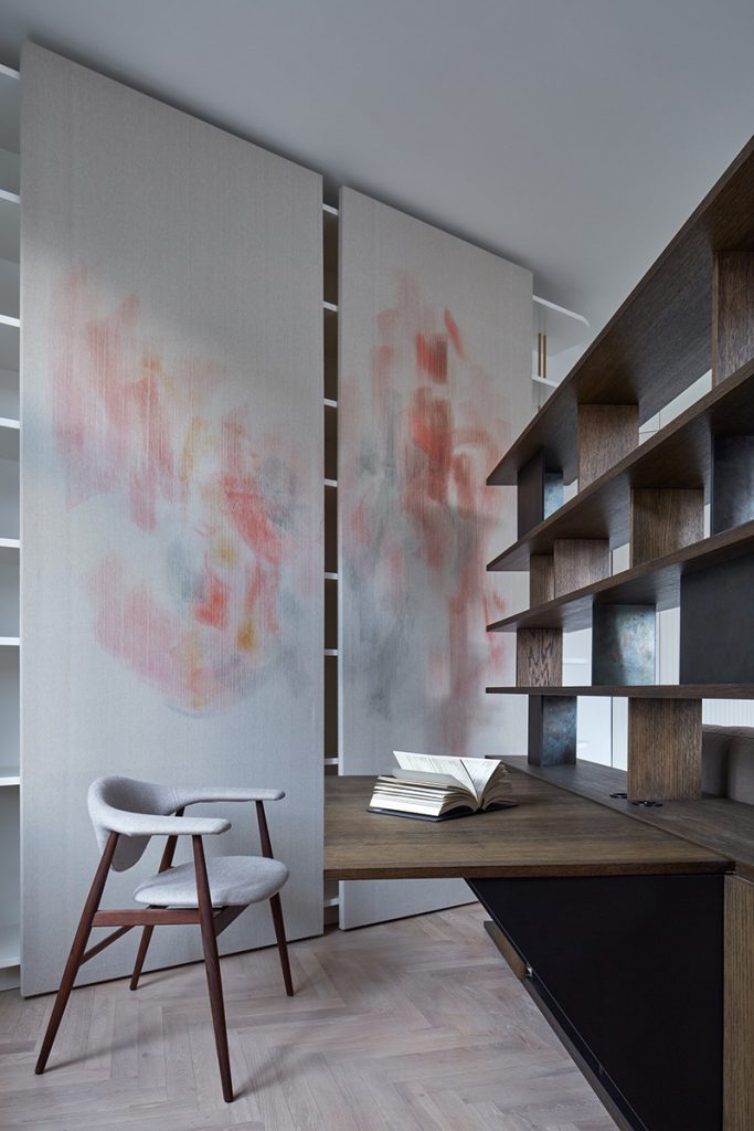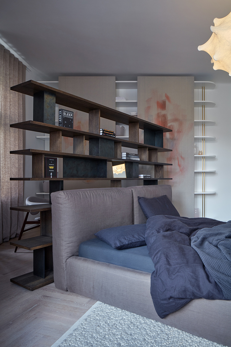 Forma atipică a dormitorului principal a dictat o soluționare pe măsură. Astfel, patul este poziționat distanțat față de perete, iar rolul căpătâiului este preluat de o bibliotecă custom, de inspirație Mid-Century Modern, ce integrează un spațiu de lucru. Ușile culisante ale dressing-ului, cu decorațiuni abstracte, amintesc de panourile japoneze. Dormitorul copiilor este un spațiu aerisit, ce lasă loc pentru interesele și activităților celor mici, piesa principală aici fiind patul-căsuță.